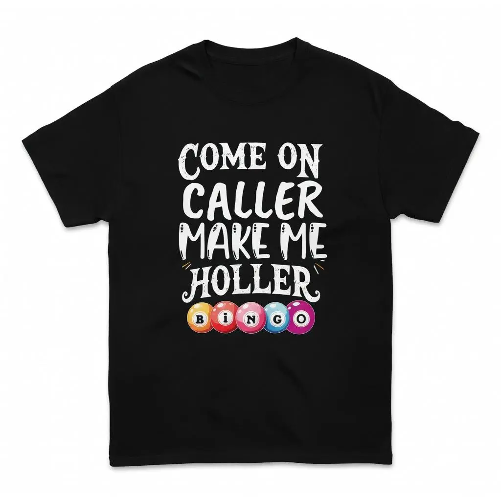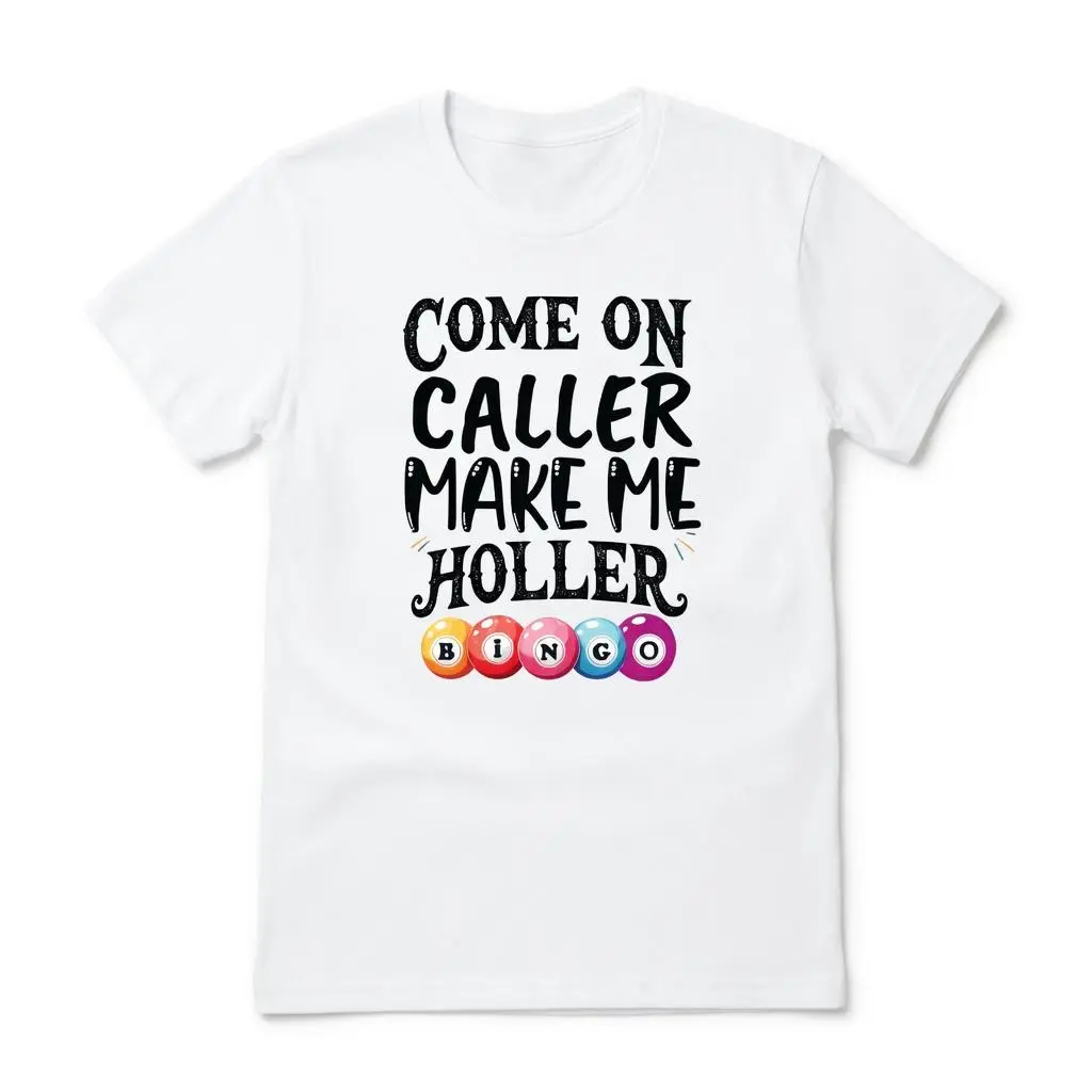 Come On Caller Make Me Holler T-Shirt, Funny Bingo Player Graphic Tee, Hilarious Bingo Night Short Sleeve Apparel, Aesthetic Lucky Bingo Queen & Gambling Enthusiast Gift Fashion Top, Viral Trendy Senior Humor Statement Streetwear Crew Neck