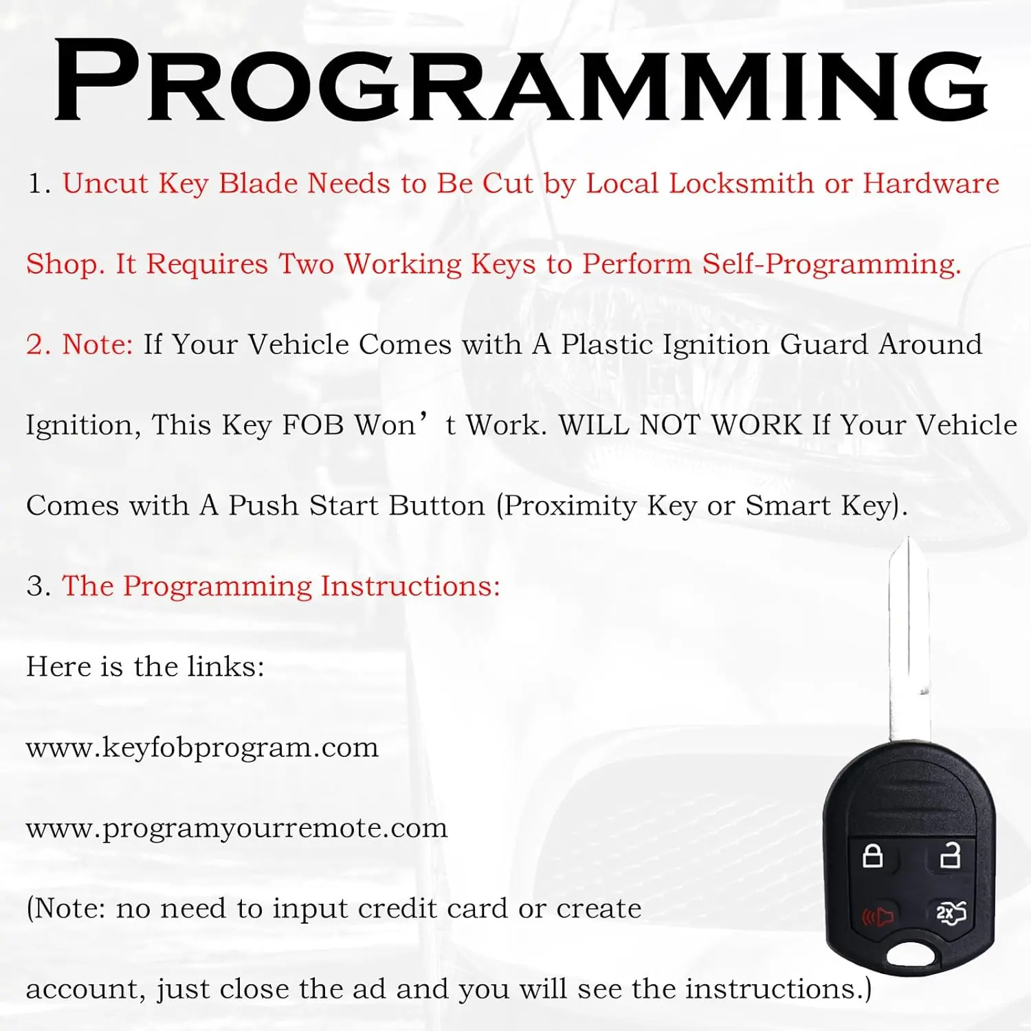For self-programming, you need two working keys. If unavailable, contact a professional locksmith or dealership. The uncut key blade must be cut by a local locksmith. It supports regular key vehicles only. This aftermarket key fob doesn't include a logo or badge.