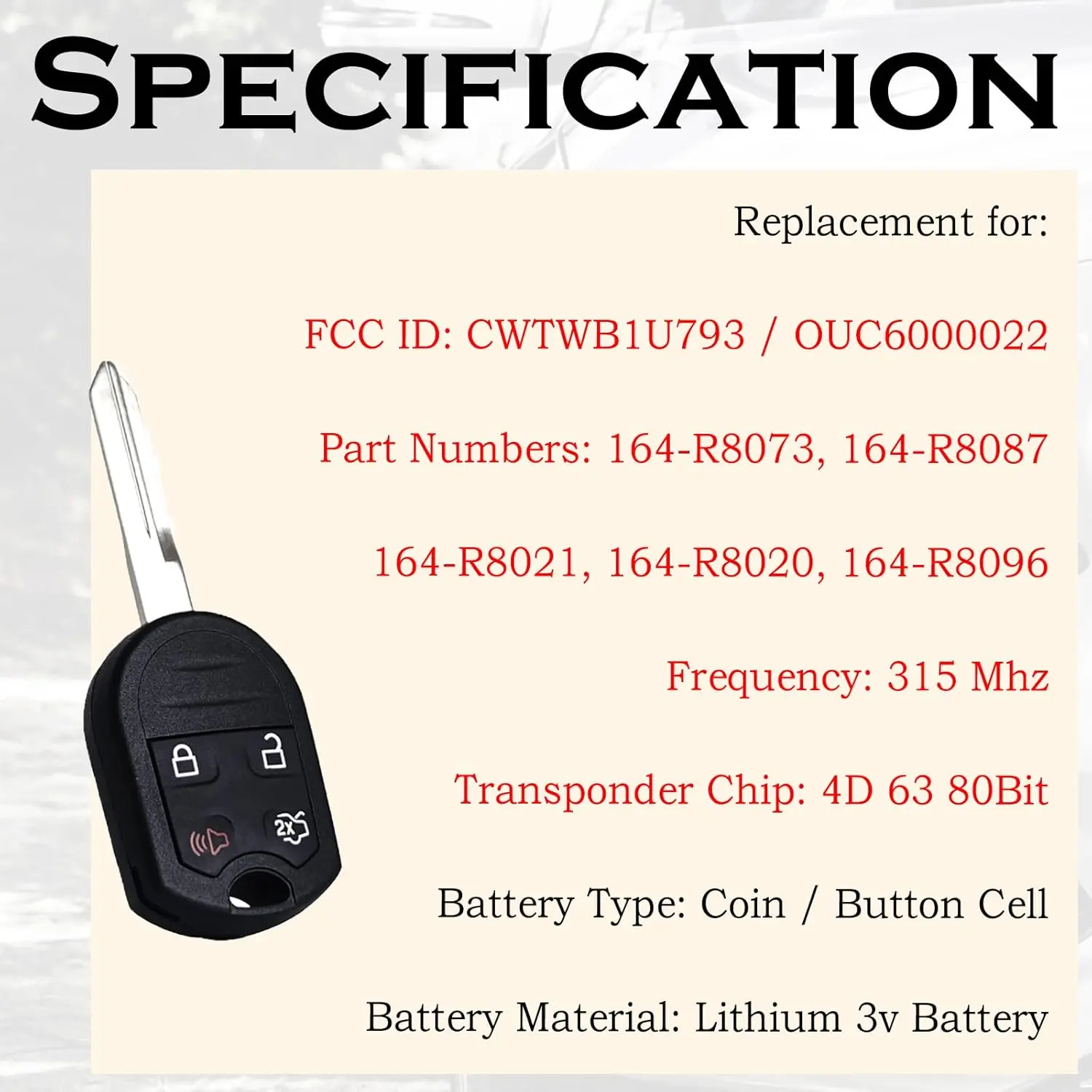 This key fob replacement fits Ford Explorer 2001-2015, Mustang, Expedition, Edge, and more. It's a keyless entry remote control with FCC ID: CWTWB1U793, OUC6000022. Part numbers include 164-R8073, 164-R8087, 164-R8021, 164-R8020, 164-R8096. It operates at 315 MHz with a lithium 3v battery. Note: It won't work with push start buttons or passive entry systems.