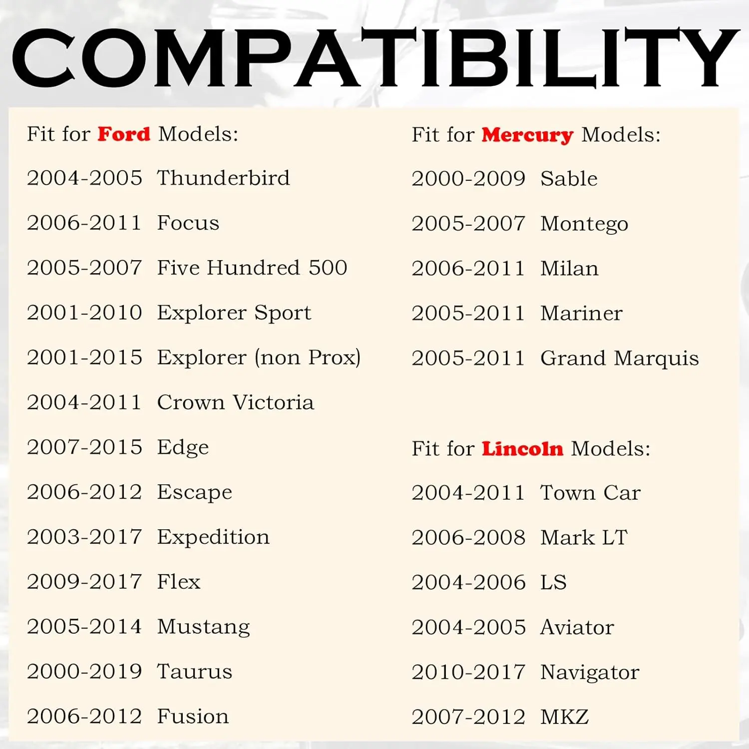 Ford Explorer, Mustang, Expedition, Edge, Focus, Taurus, Escape, Flex, Fusion, Crown Victoria, Five Hundred, Thunderbird, Lincoln Navigator, MKZ, Aviator, Mark LT, Town Car, Sable, Montego, Milan, Mariner, Grand Marquis