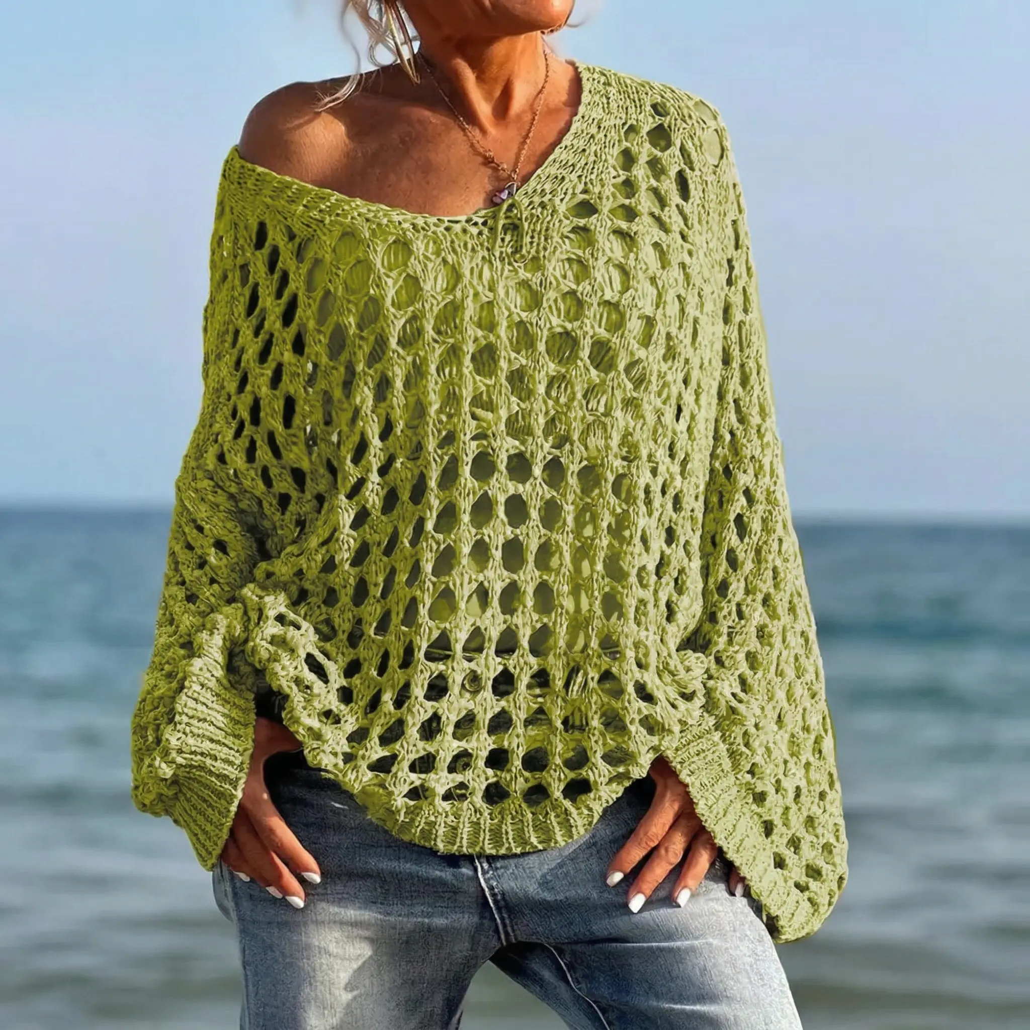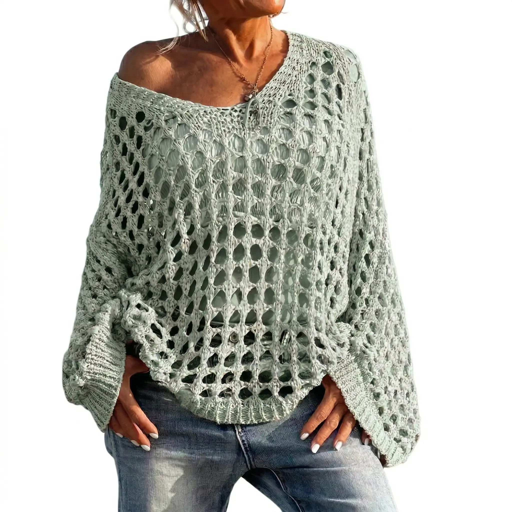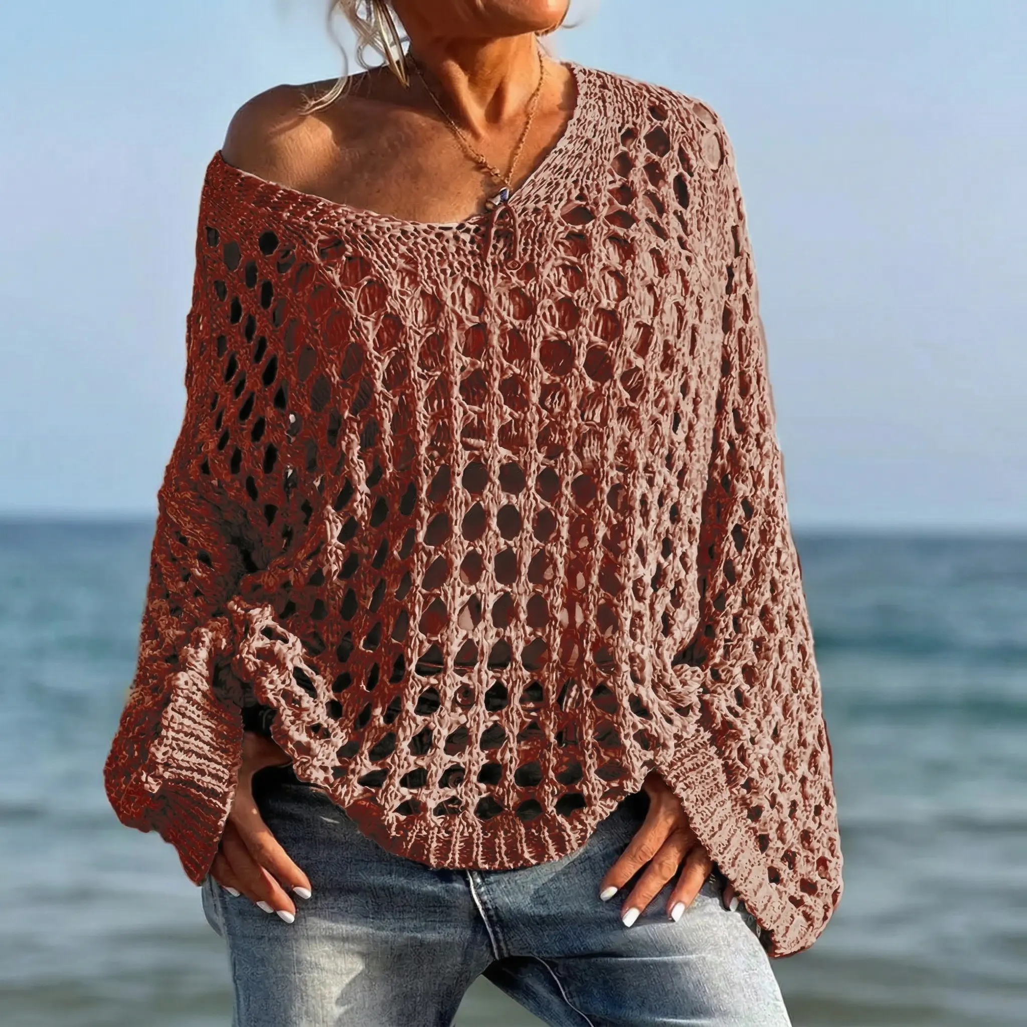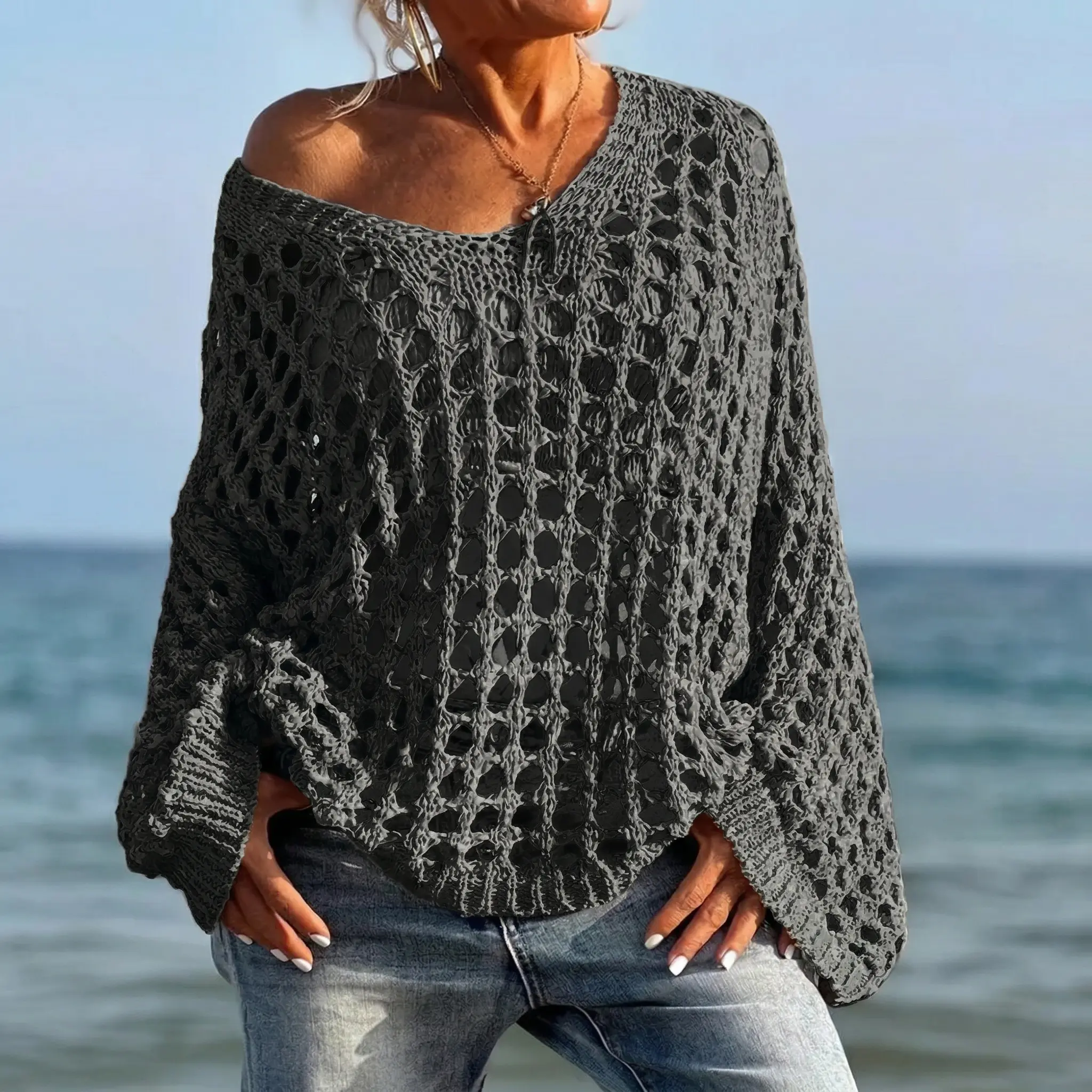 Upgrade your casual wardrobe with this chic slouchy knit pullover. Perfect for the modern woman who loves a relaxed yet trendy vibe, this sweater features an open-knit crochet design. It's highly breathable and eye-catching, making it a standout piece.