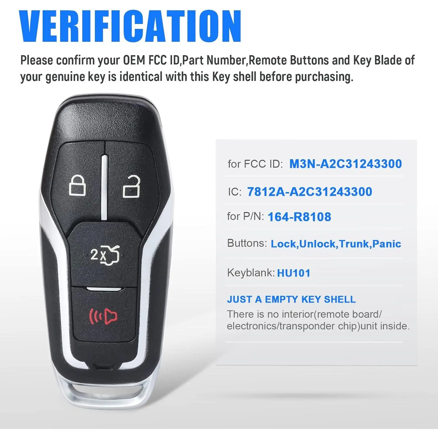 Remote Fob Case Shell Cover for Ford Edge/Explorer/Fusion/Mustang for Lincoln MKC/MKX(FCC ID:M3N-A2C31243300 P/N:164-R8108) 4 Buttons,Just Shell