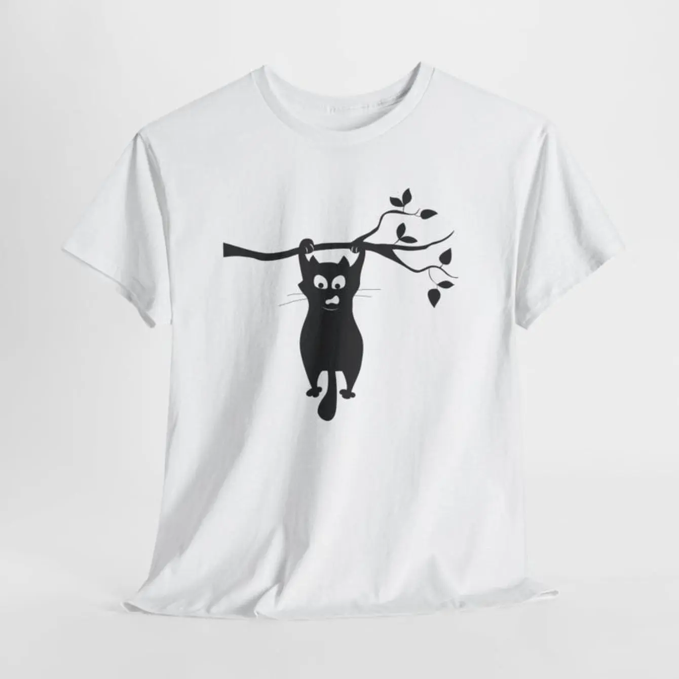 Women's cute cat Graphic T-Shirt - Short Sleeve Crew Neck Regular Fit Casual Wear | Soft & Breathable Fabric, Durable Print, Everyday Comfort, Machine Washable, minimalist cat hanging from a tree branch