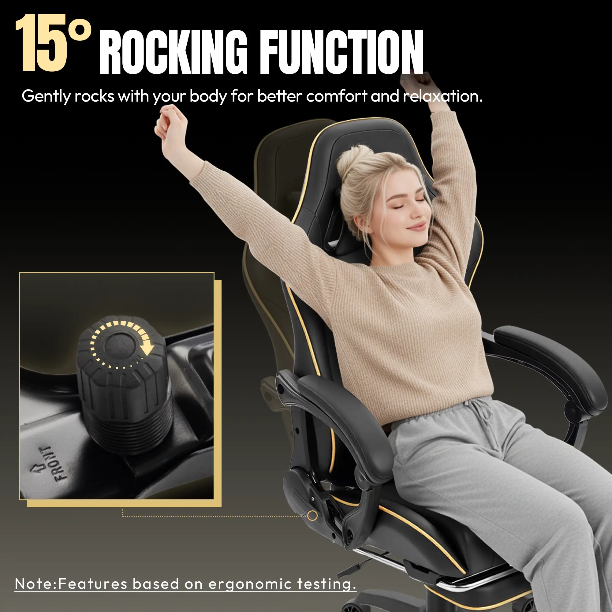 ·Built for Racing Gaming Style: This gaming chair is designed for long PC gaming and video game sessions. The 90°–150° reclining high back and 15° rocking mode let you switch from intense matches to relaxed play without leaving your gaming setup.