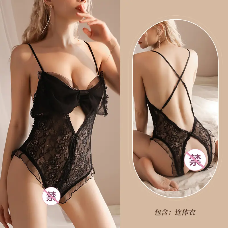 Sexy Black Floral Lace Bodysuit with Mesh Bow – V-Neck, Open Back, Adjustable Straps, Teddy Lingerie for Women