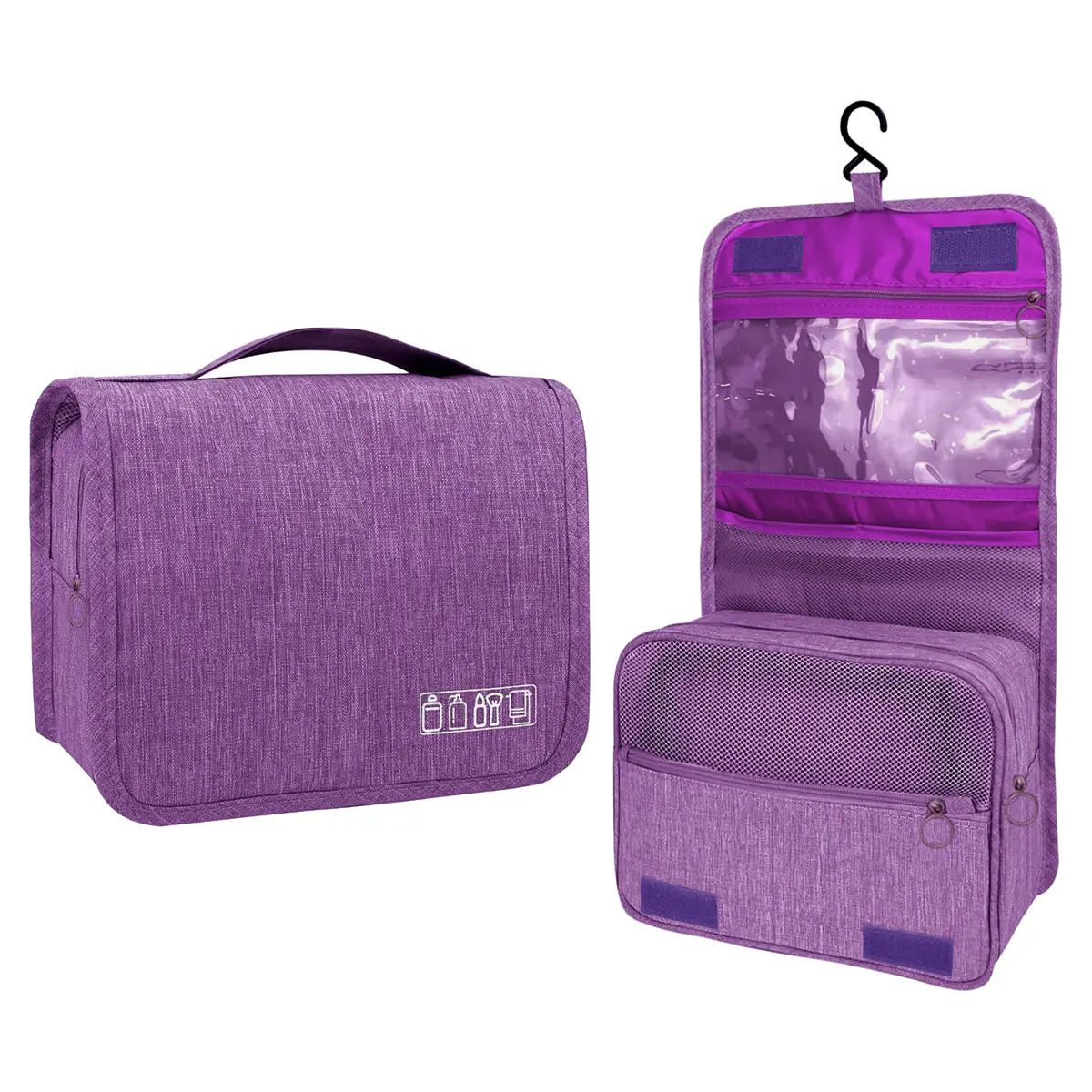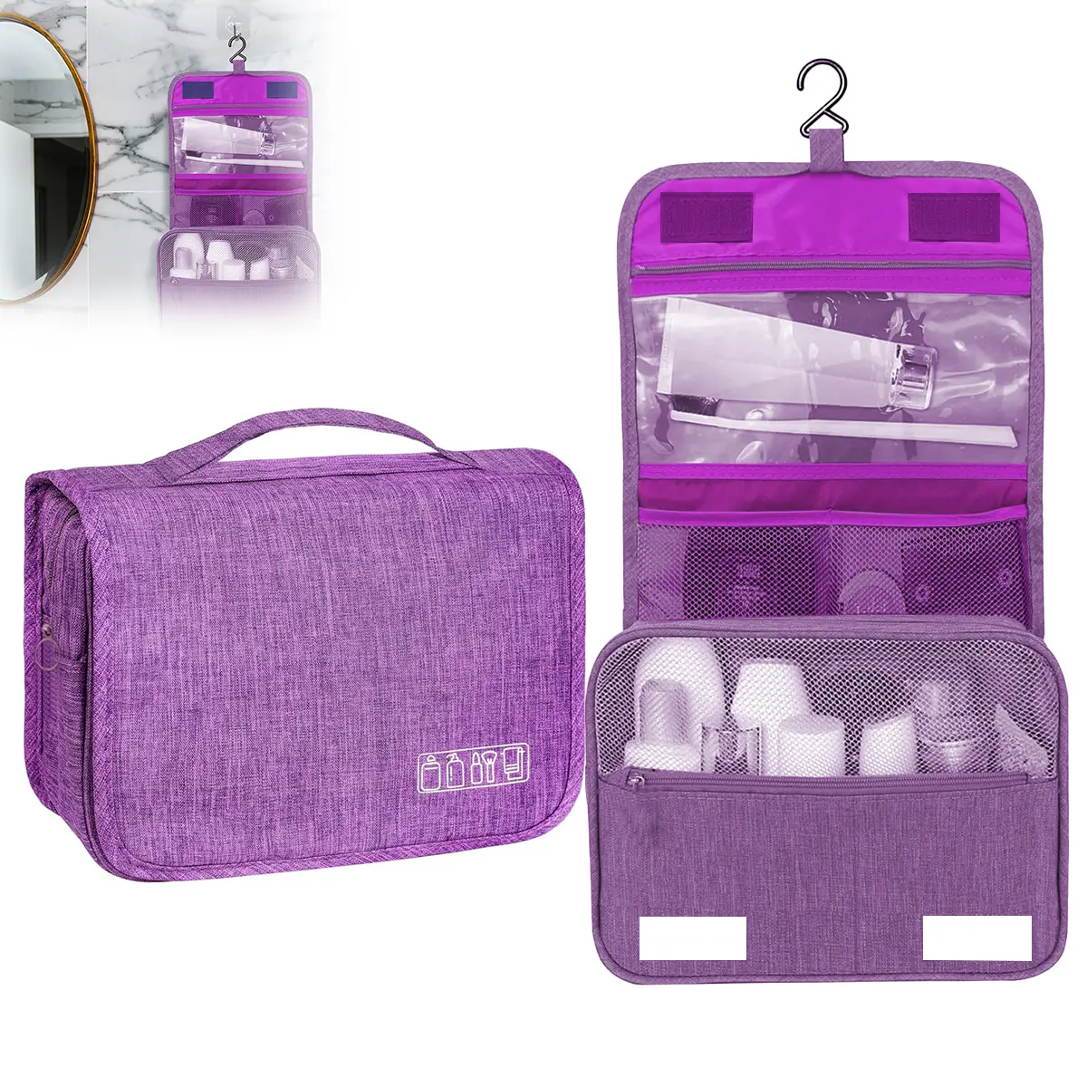 Travel makeup bag, suitable for both men's and women's cosmetics and skin care products. Made of polyester fiber. Portable hook storage box. Used to distinguish wet wipes from dry wipes. Purple color.