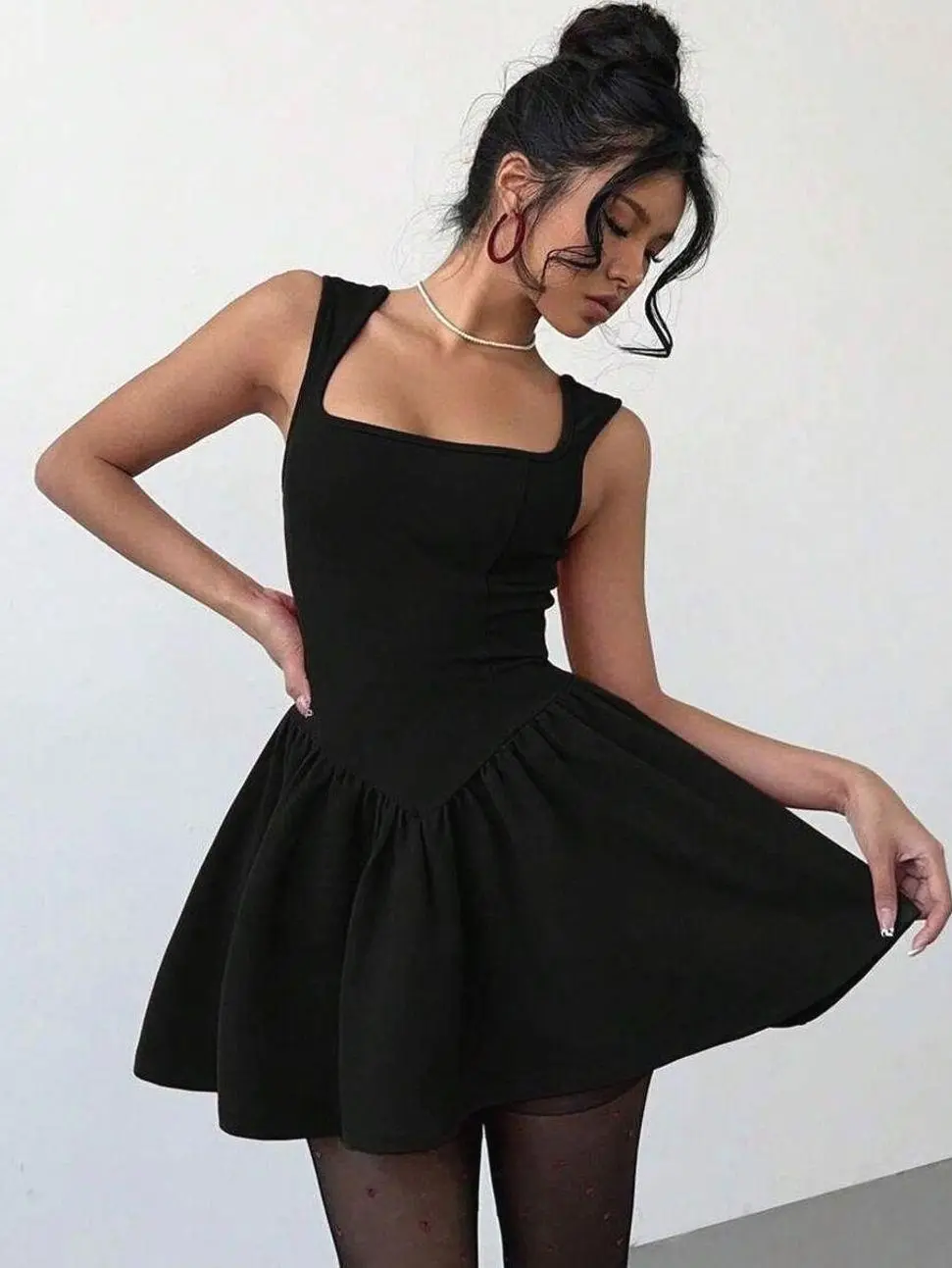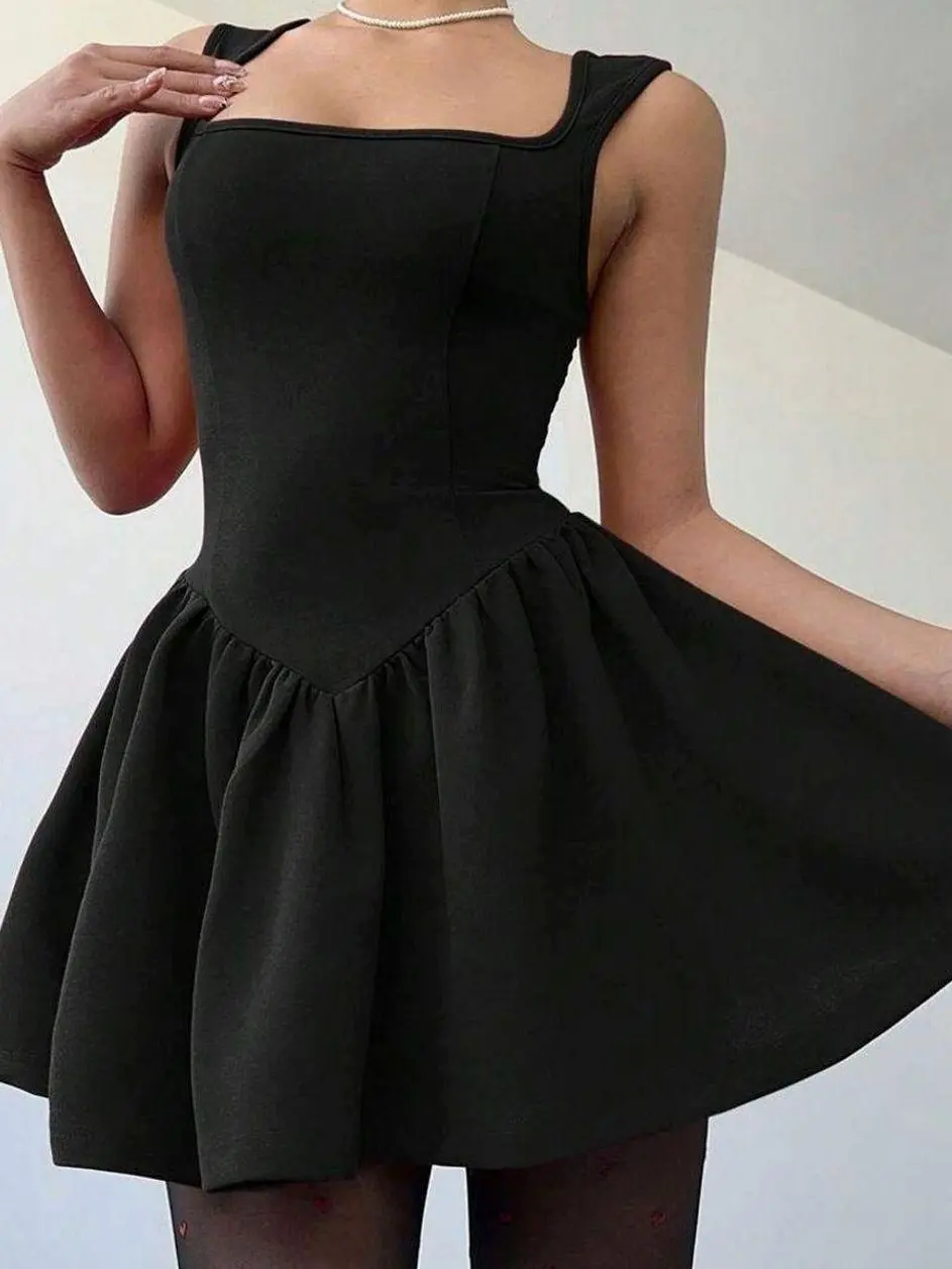 Women's Casual Solid Color Square Neck Pleated Sleeveless Mini Dress Summer Vacation Outfit