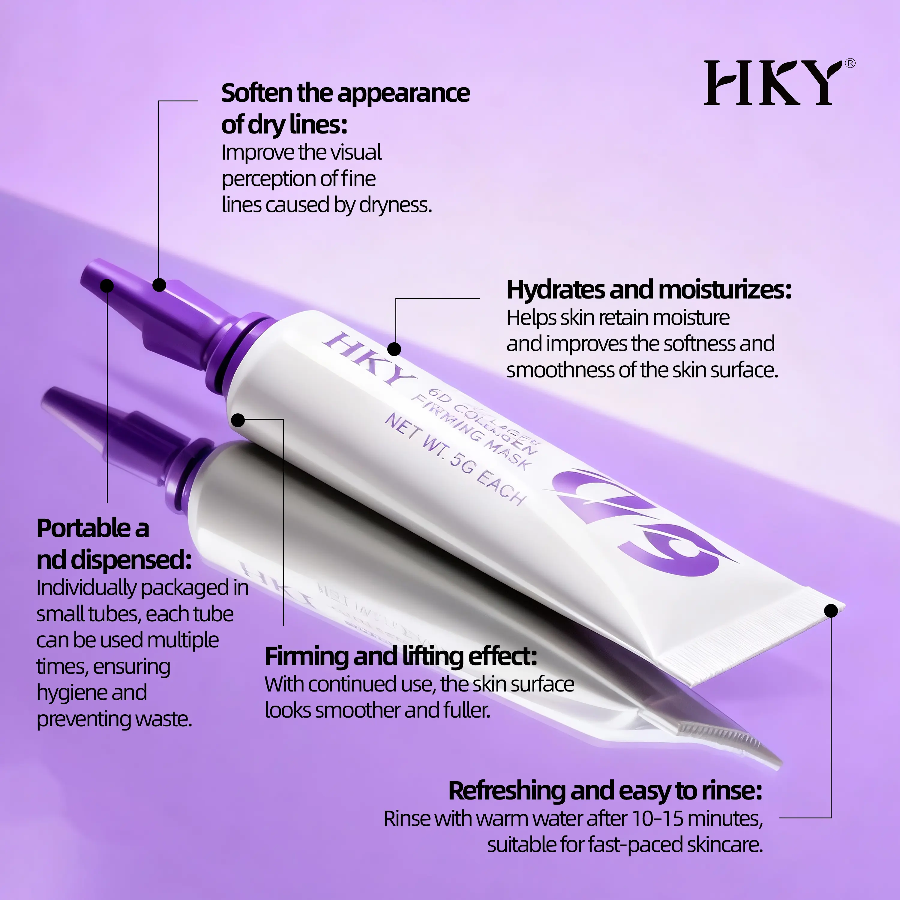 ✨ HKY 6D Collagen Firming Mask is a hydrating wash-off mask, ideal for sensitive skin. It offers a quick 10–15 min use, smoothing fine lines and providing a radiant look. Perfect for night-out prep, this mask is powered by a 6D Collagen Complex and marine botanical ferment.