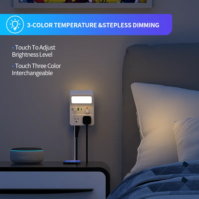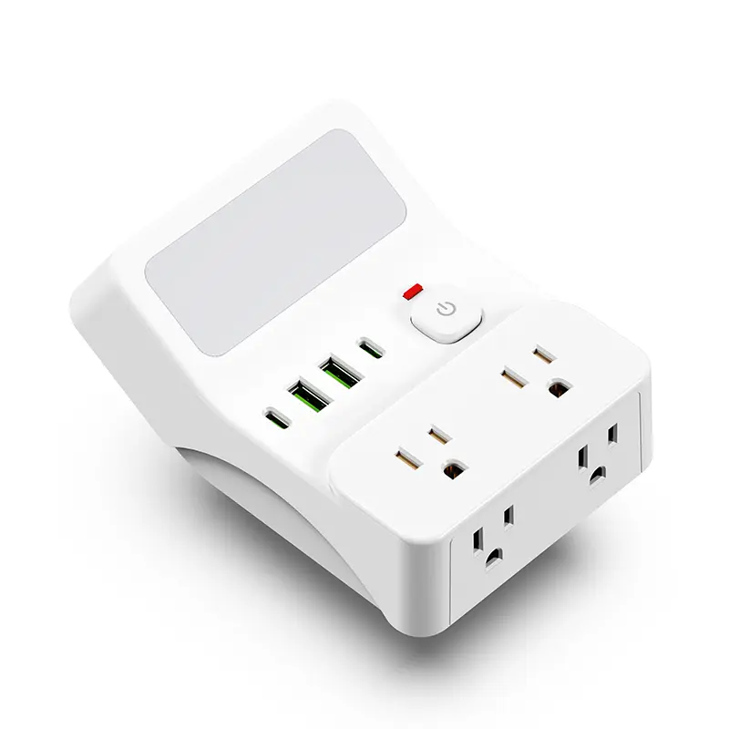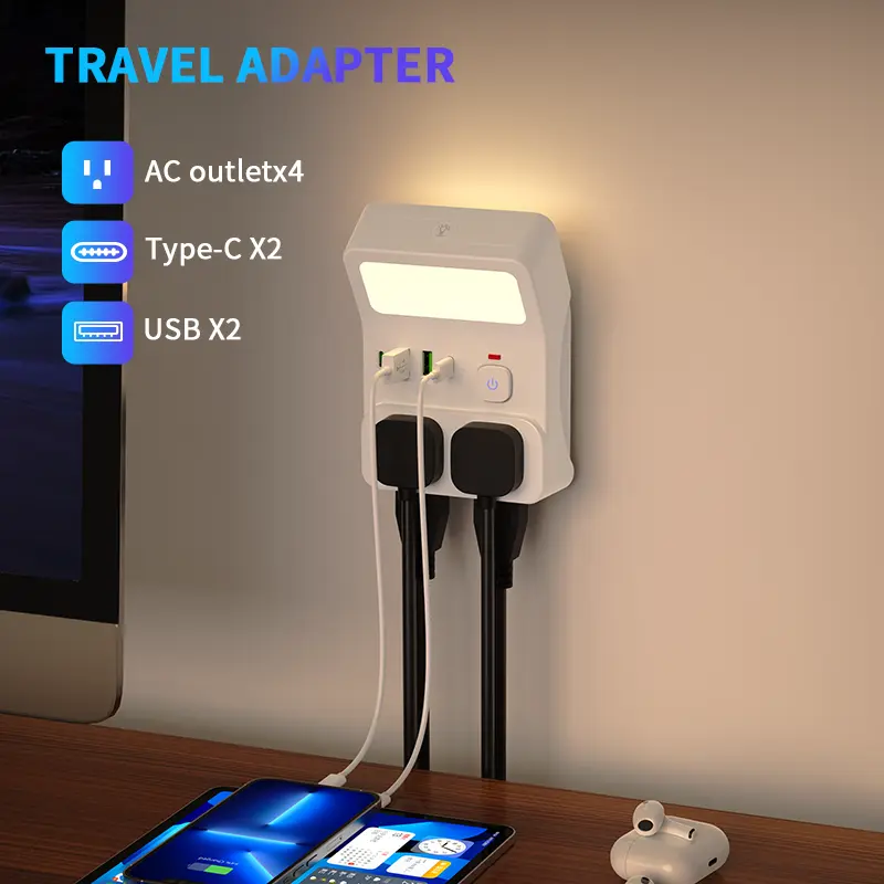 1pc night light wall socket, 4 AC sockets with overload protection, maximum power of 1250W, 10A, 2 USB 2 Type-C, suitable for home, office, travel and computer.
