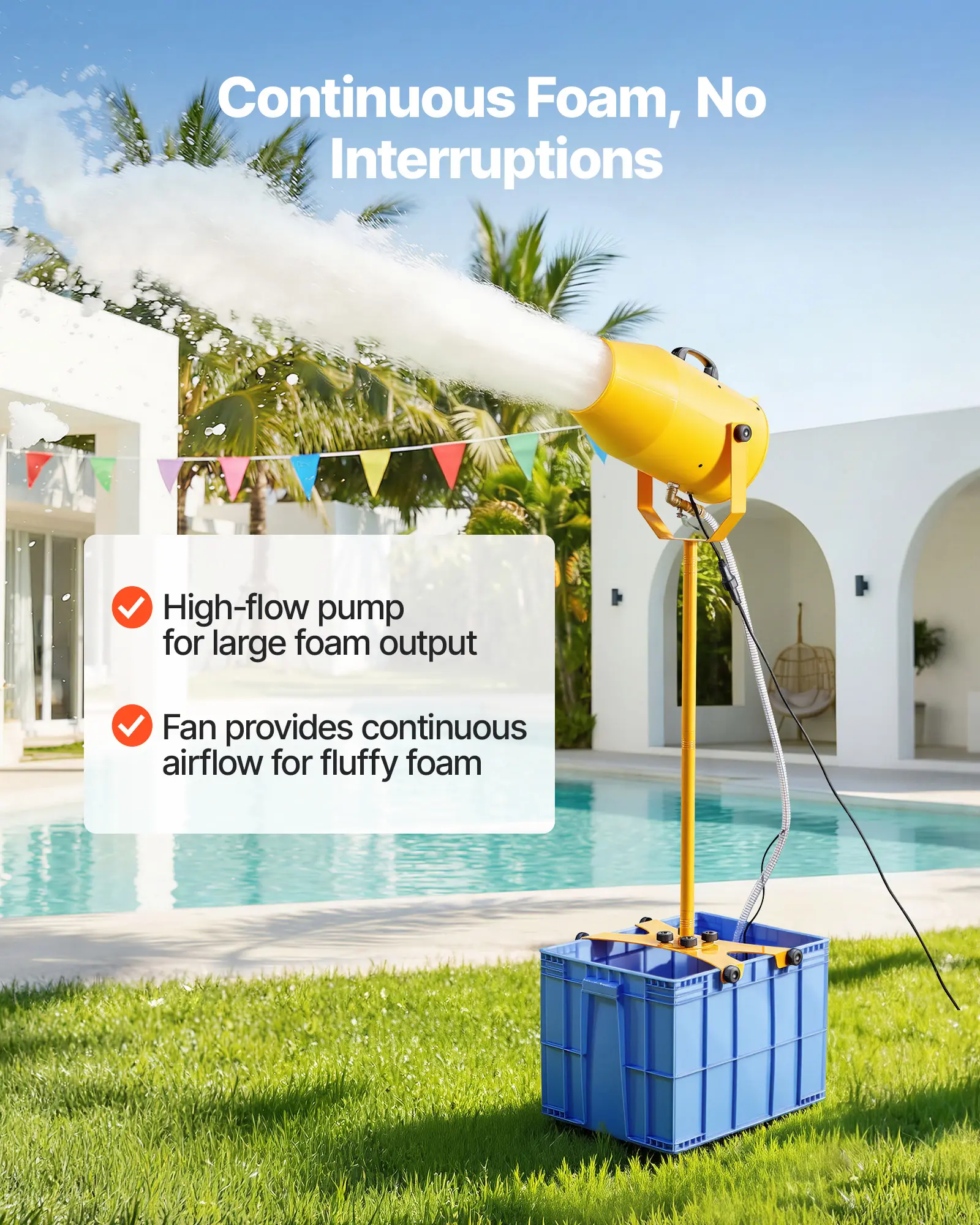 Steady Foam Output: Using a strong fan and an 2500 L/H high-flow pump with a 2.5 m lift, foam begins forming automatically in about 20 seconds. The bubble foam machine delivers consistent and balanced foam output, helping keep the party atmosphere continuous without interruptions caused by foam loss