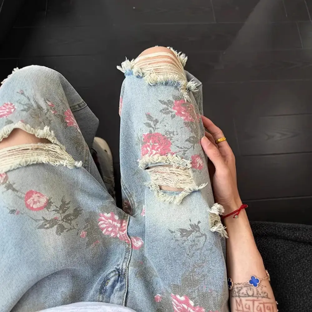 Vintage Cute High Waisted Straight Leg Jeans Casual Y2K Flower Printed Fringe Ripped Streetwear Denim Pants