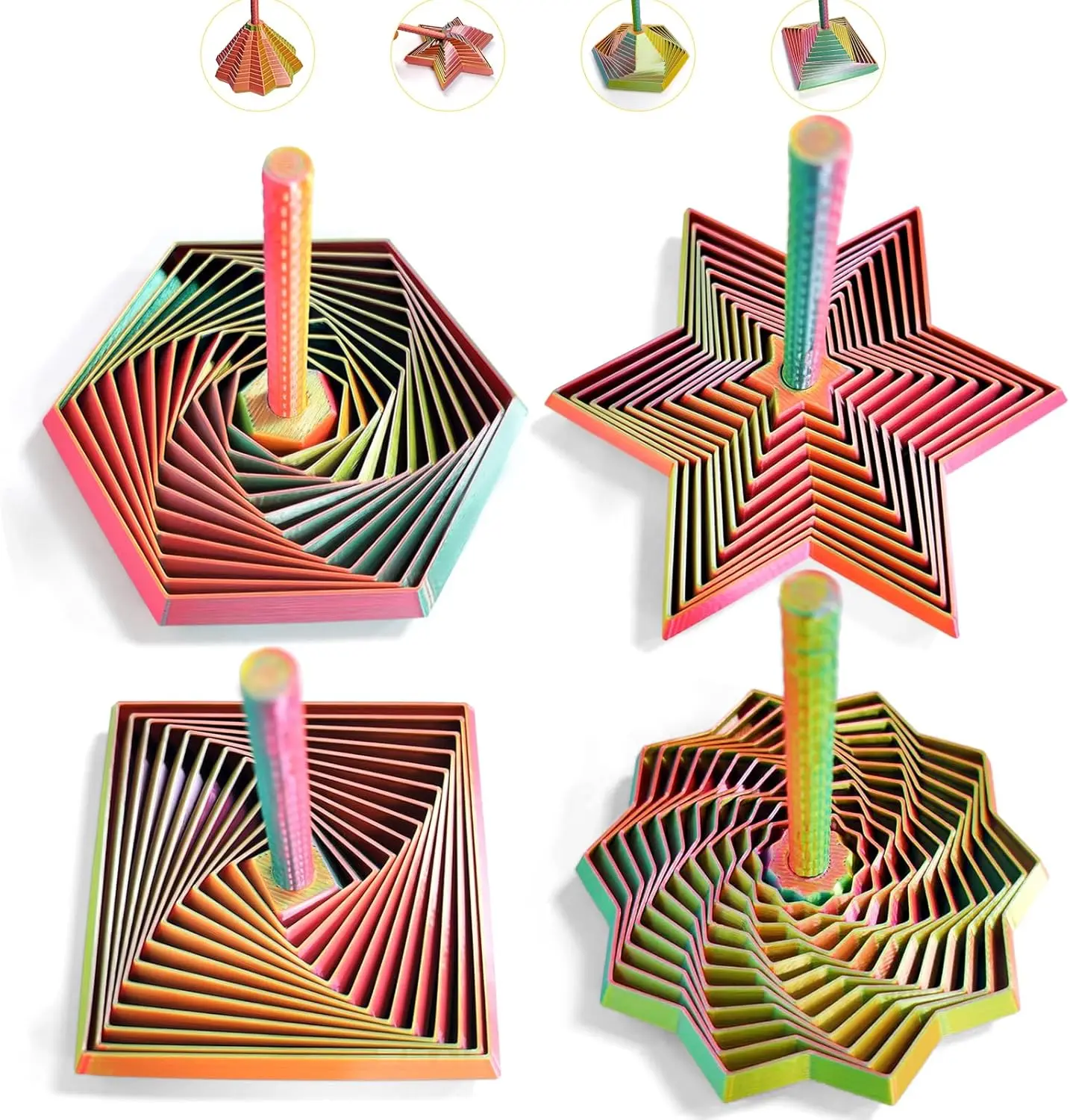 ·Relieve stress and enhance focus with our premium 3D printed fidget toys for adults, designed to provide a satisfying sensory experience through tactile manipulation and soothing ASMR sounds. This elegant set includes four unique multi-layered geometric shapes — hexagon, star, square, and octagon — each crafted from high-quality, durable plastic with a silk-like metallic finish in vibrant gold, green, purple, and rainbow hues. Each fidget features a built-in handle that allows you to lift and transform the shape into a dynamic pyramid form, or twist and rotate layers to create mesmerizing visual patterns. The smooth, precise movement of the interlocking layers produces a distinctive “click-click” ASMR sound, perfect for meditation, concentration, or anxiety relief. With an average width of 3.3 inches, these compact yet substantial toys are ideal for desk use, travel, or on-the-go relaxation. Designed exclusively for adults aged 14+, this set avoids child product compliance requirements while delivering a sophisticated, calming experience. Whether you're managing stress, boosting focus, or simply enjoying the hypnotic motion of geometry in motion, these 3D printed fidget toys offer both style and function — a perfect blend of art, engineering, and mindfulness.