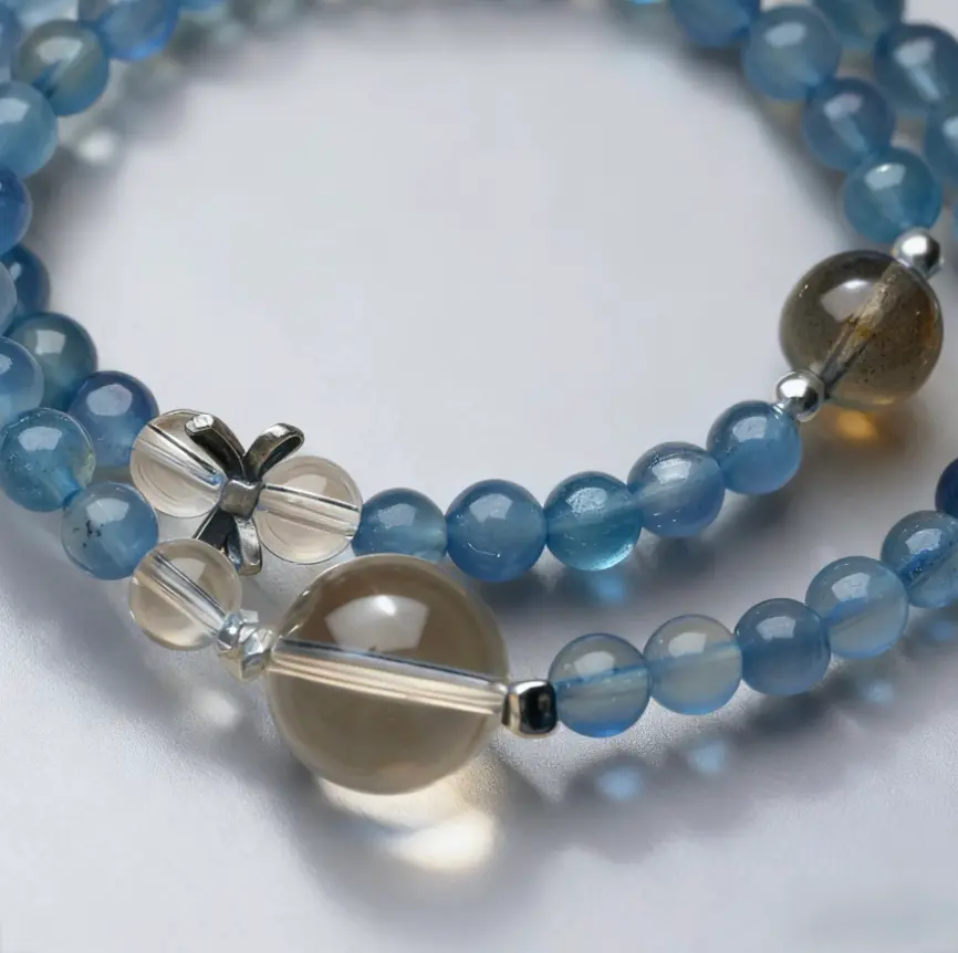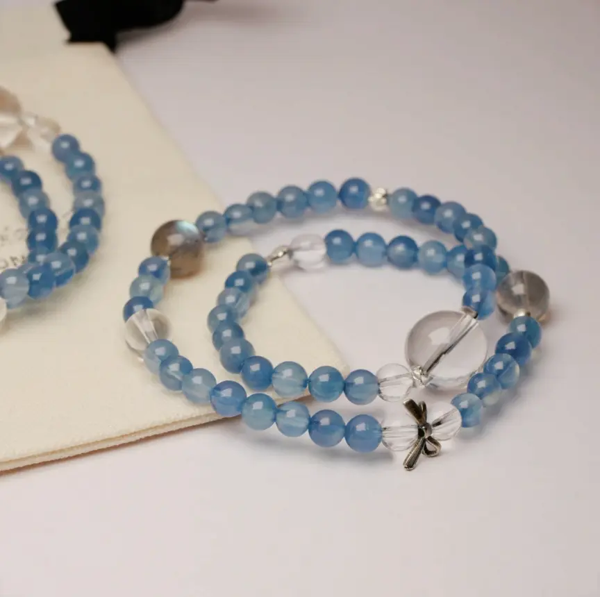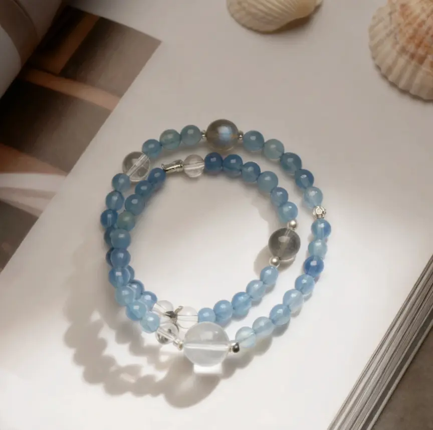 This Ocean Series double-layer bracelet weaves together the deep, mysterious blue of Devil Aquamarine with the crystal clarity of Clear Quartz—like wearing the gentle gradient from ocean surface to ocean depths.