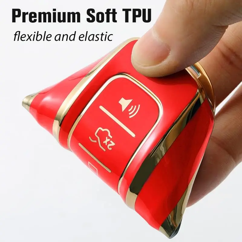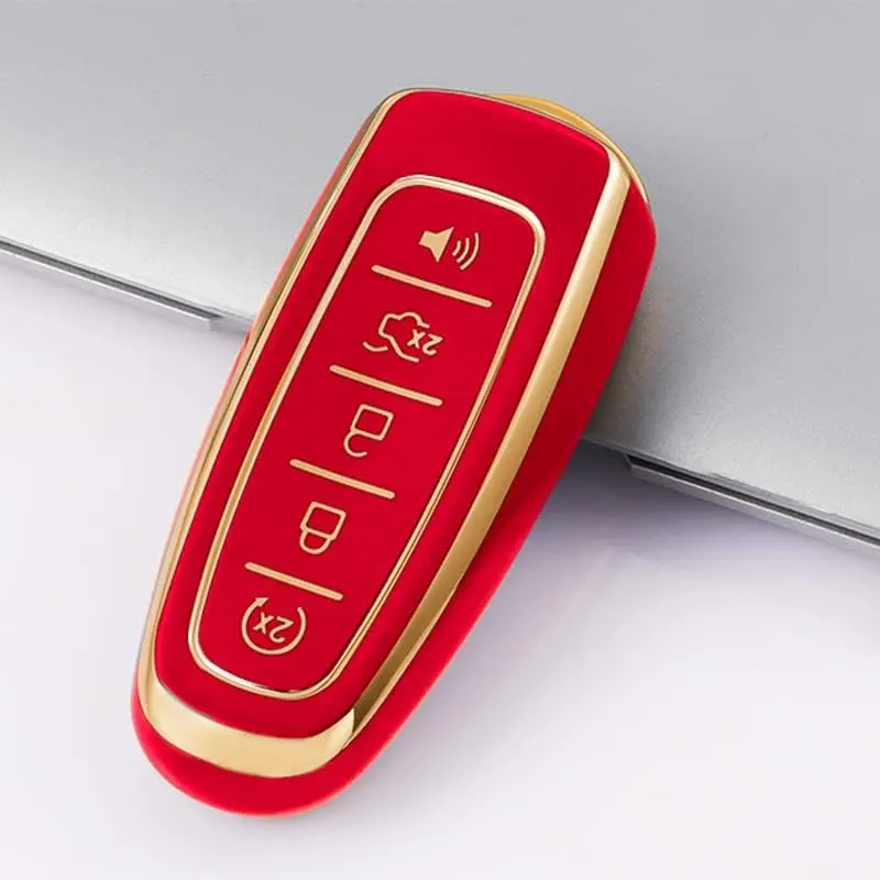 This TPU Key Fob Cover is designed for Ford C-Max, Edge, Escape, Expedition, Explorer, Flex, Focus, Taurus, Lincoln MKS, MKT, MKX, Navigator. It offers full protection with a soft TPU material. Comes with a bling key ring in red. Ideal for long and thin key fobs.