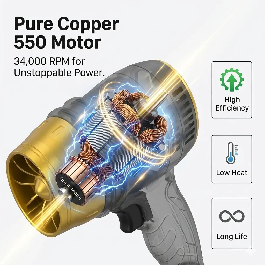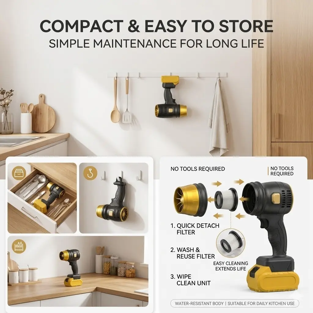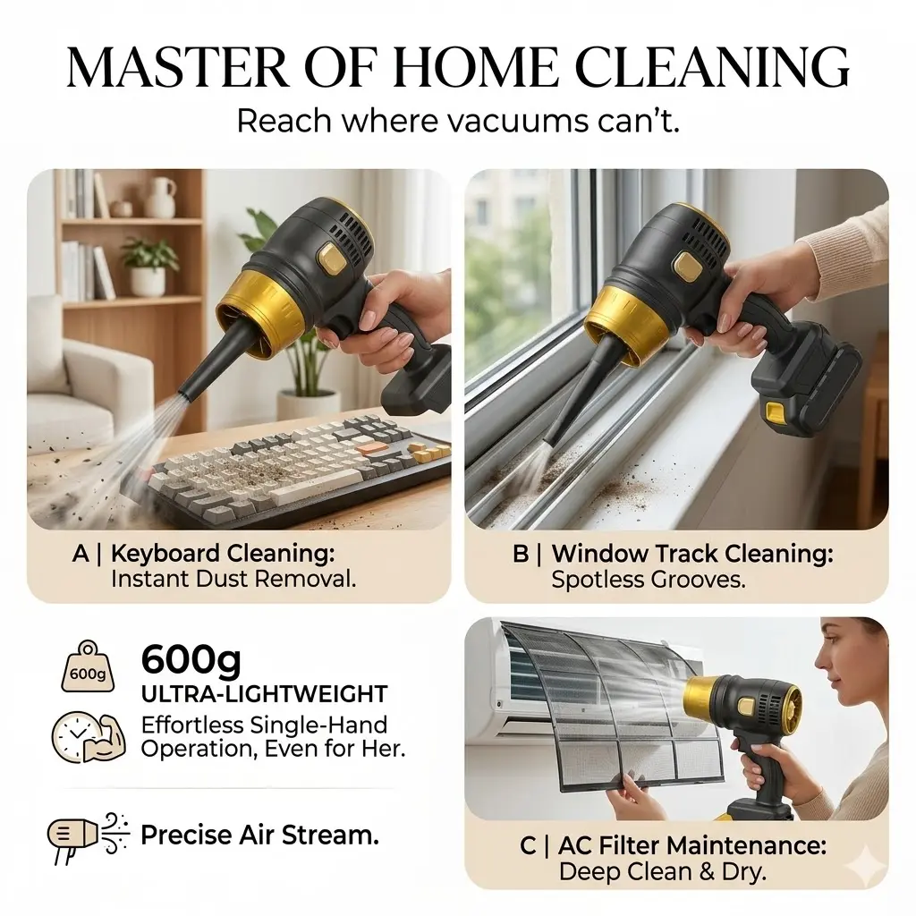 🏠 Home Cleaning: Blow dust from furniture, blinds, and hard-to-reach corners; remove pet hair from carpets and upholstery.