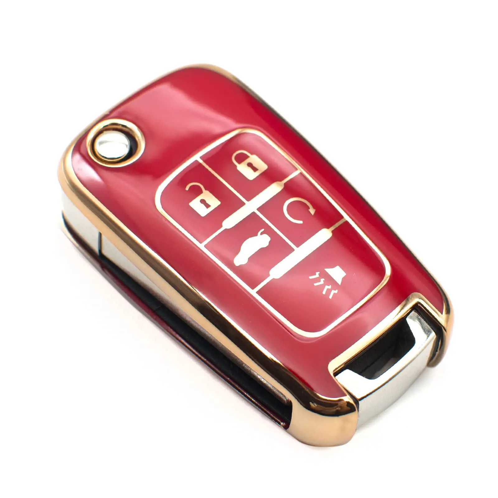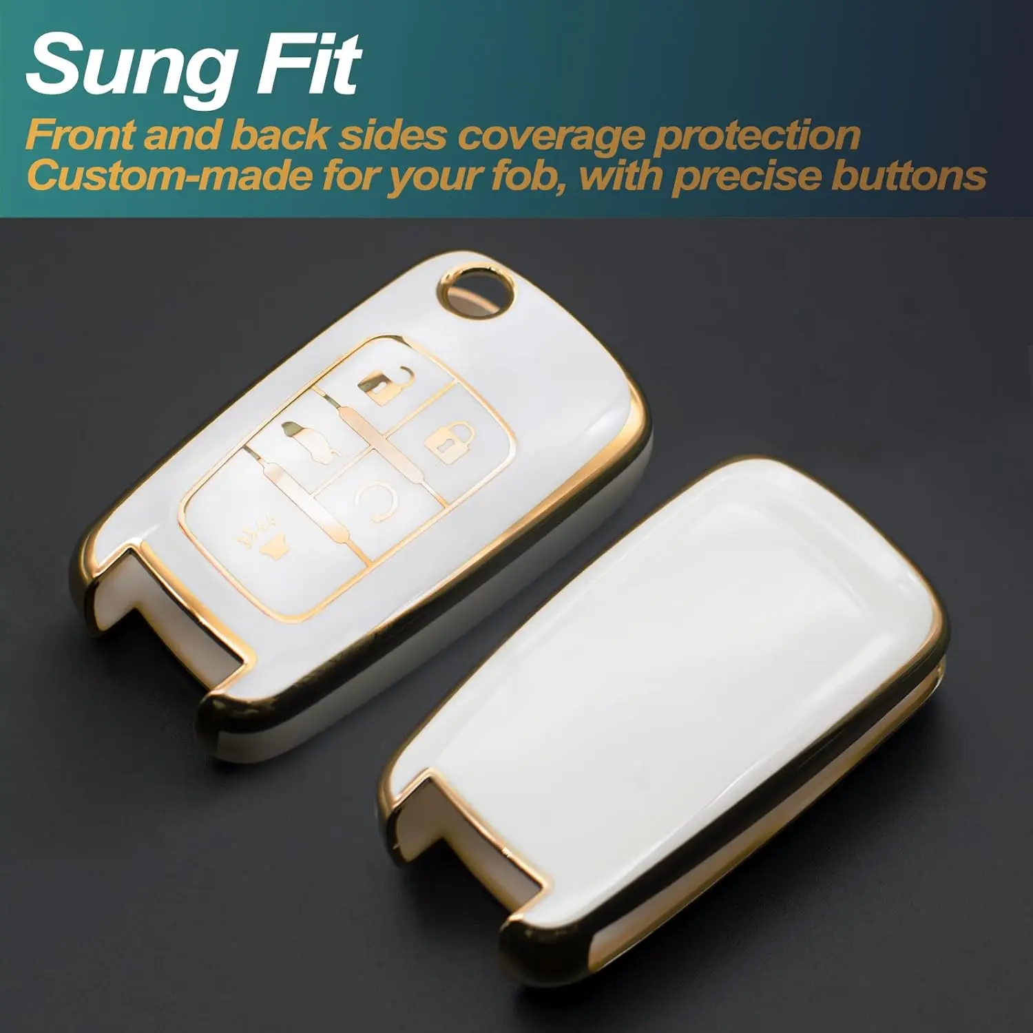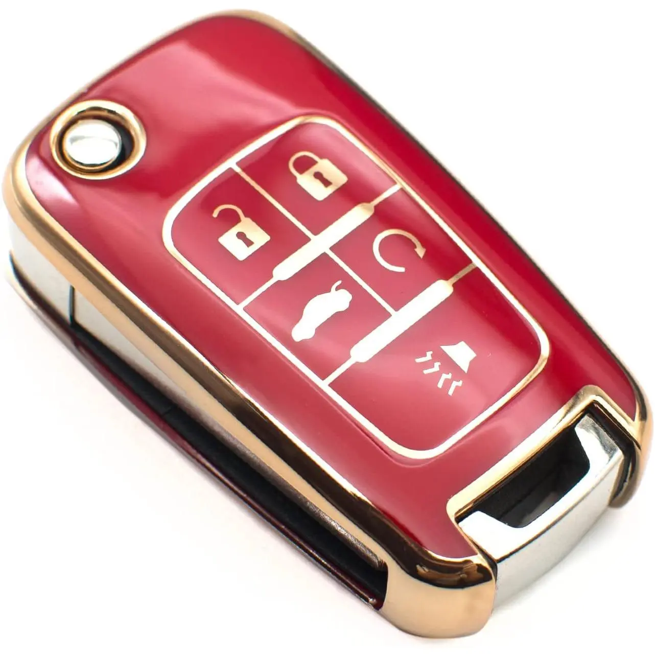 This white TPU key fob cover is compatible with Chevy, Chevrolet, GMC, and more. It fits models like Equinox, Camaro, Cruze, Malibu, Sonic, Volt, Spark, Impala, Buick, Encore, and Allure. Protect your key fob with this stylish cover.