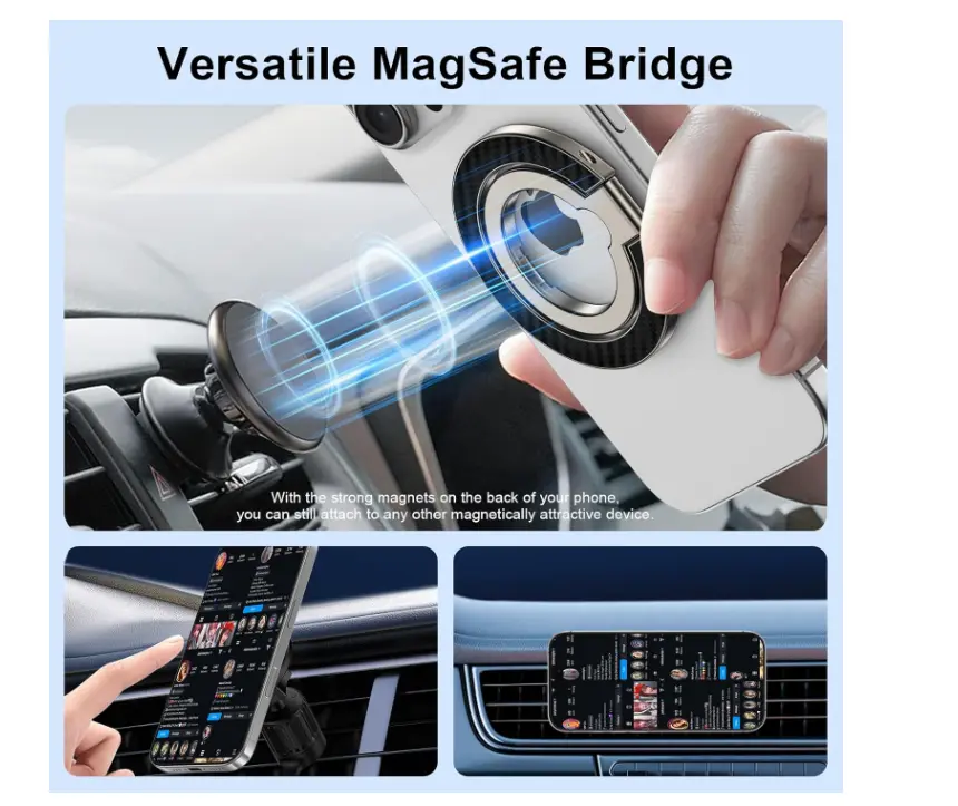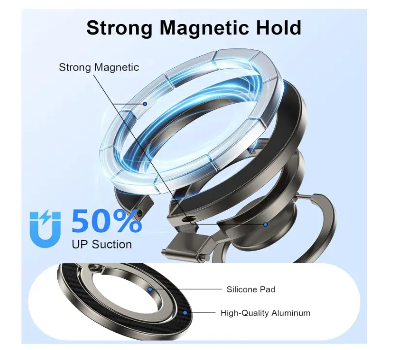 This Magnetic Phone Ring Holder is designed for MagSafe Dual-Side Magnetics. It fits seamlessly with Samsung Galaxy S26, S25, S24 Ultra, Z Flip7, and iPhone 17, 16 Plus, 15 Pro Max. The removable Magsafe Phone Grip offers flexibility and convenience. Perfect for users seeking a secure and stylish phone holder.