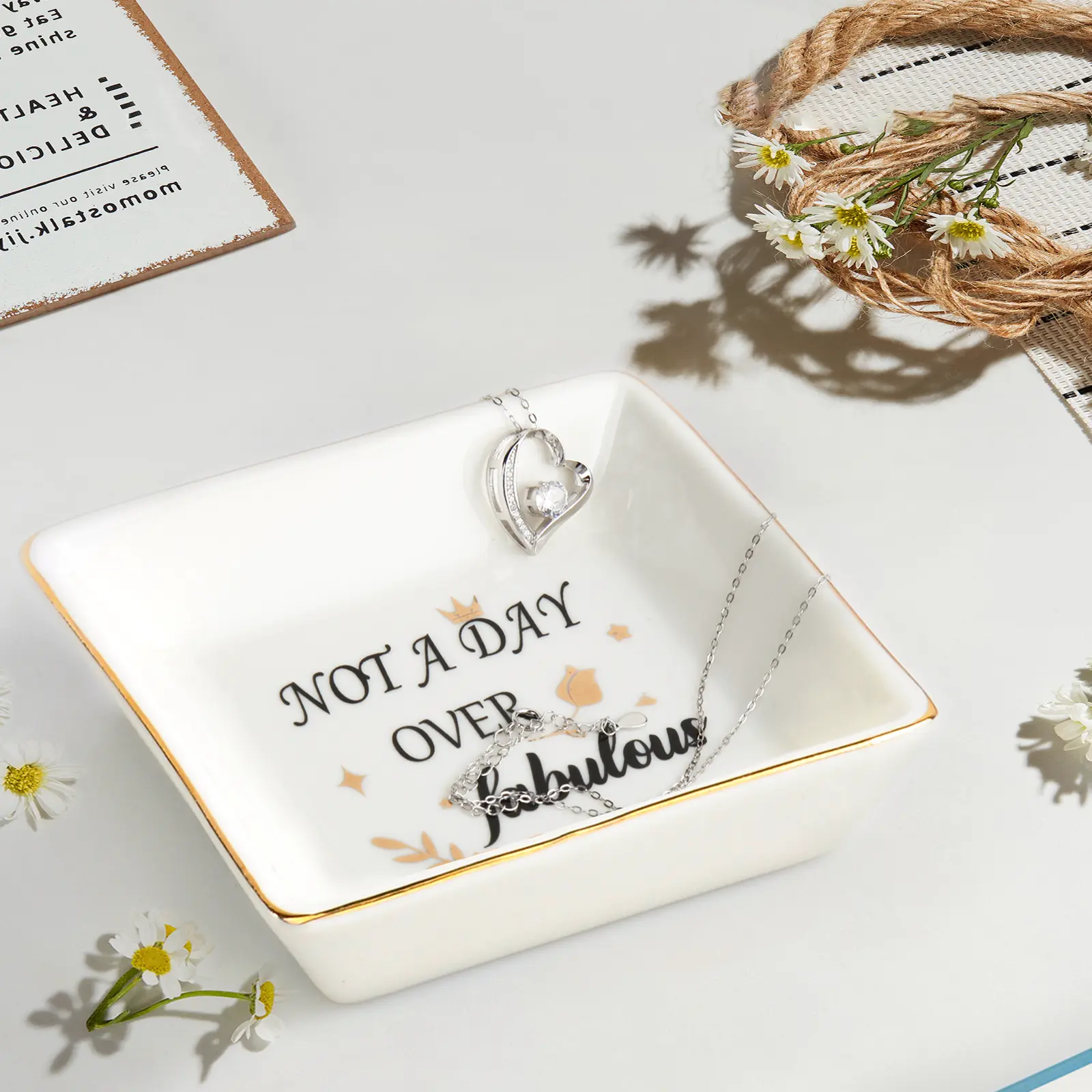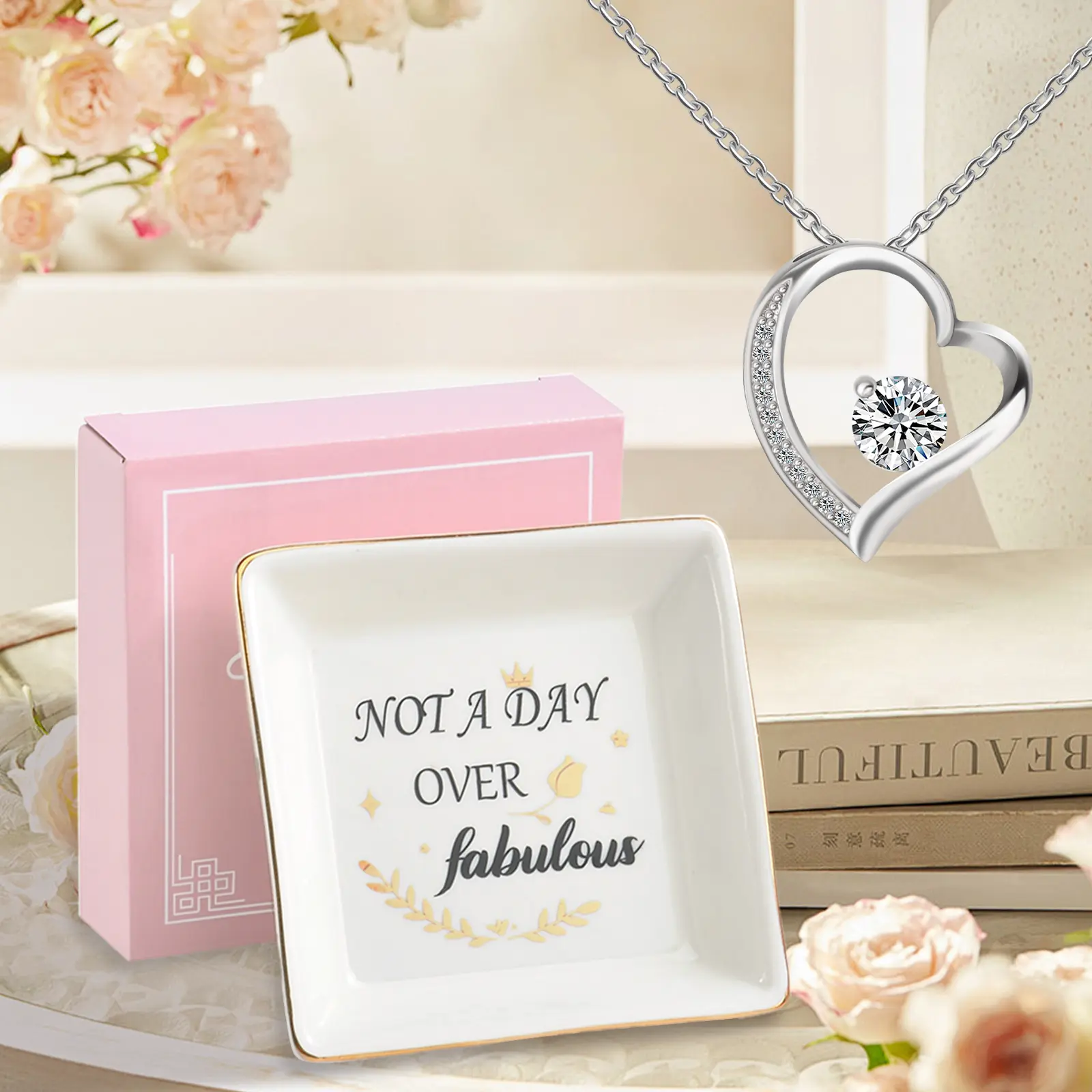 A beautiful ceramic jewelry organizer + a timeless heart necklace, printed with the iconic "Not A Day Over Fabulous" quote.