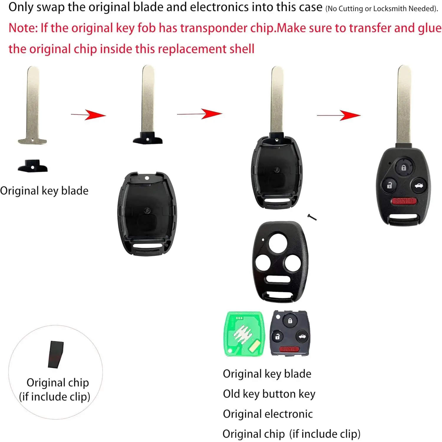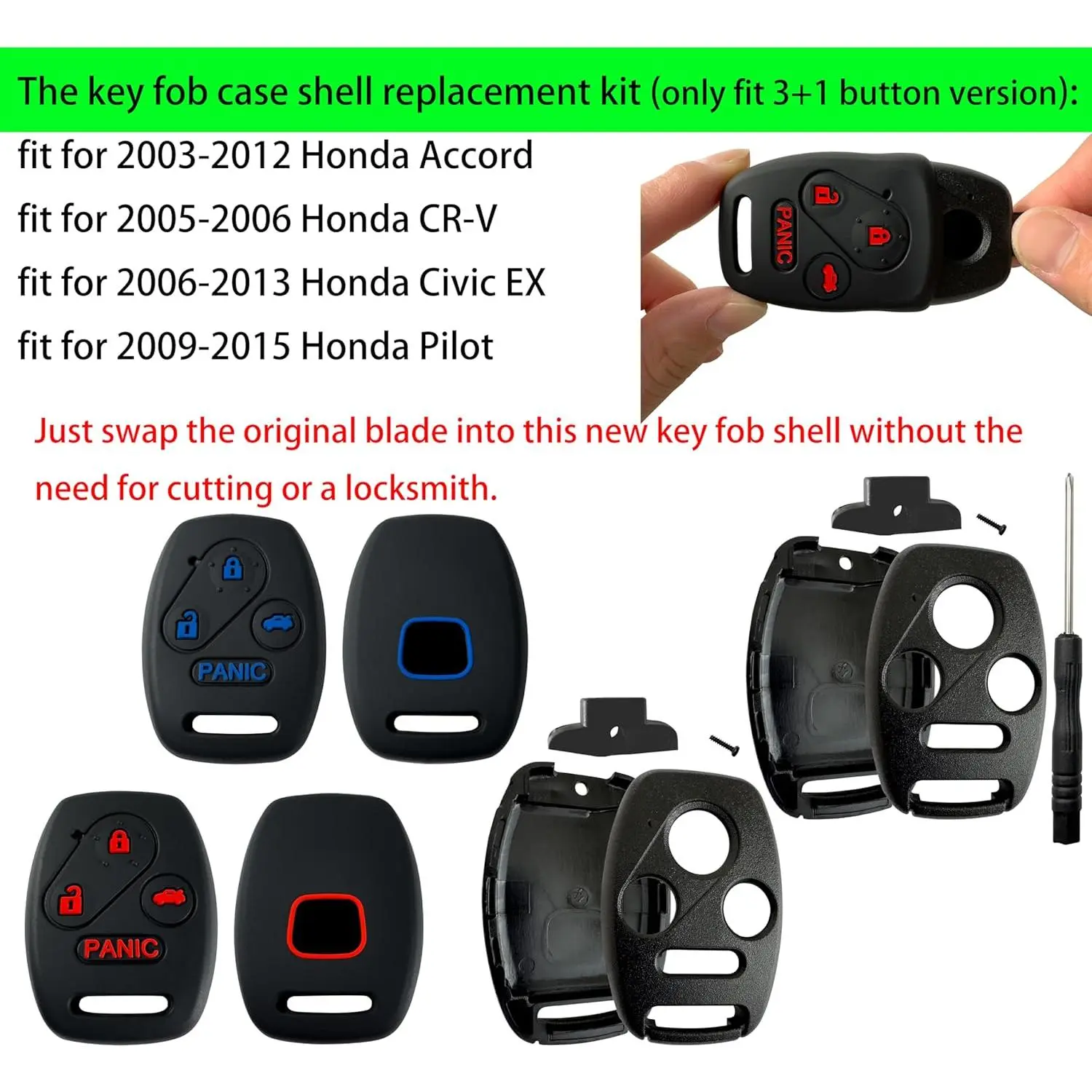 This kit fits 2003-2012 Honda Accord, 2005-2006 CR-V, 2006-2013 Civic EX, and 2009-2015 Pilot. It's a straightforward solution for key fob case replacement. The kit is designed for specific part numbers, ensuring a perfect fit. Enhance your driving experience with this reliable accessory.