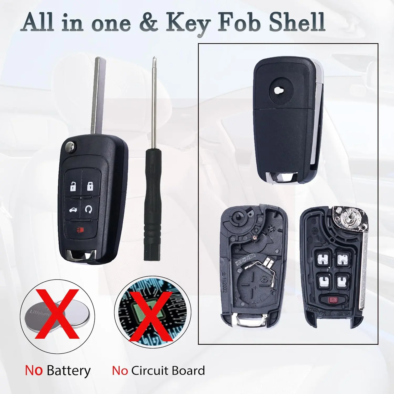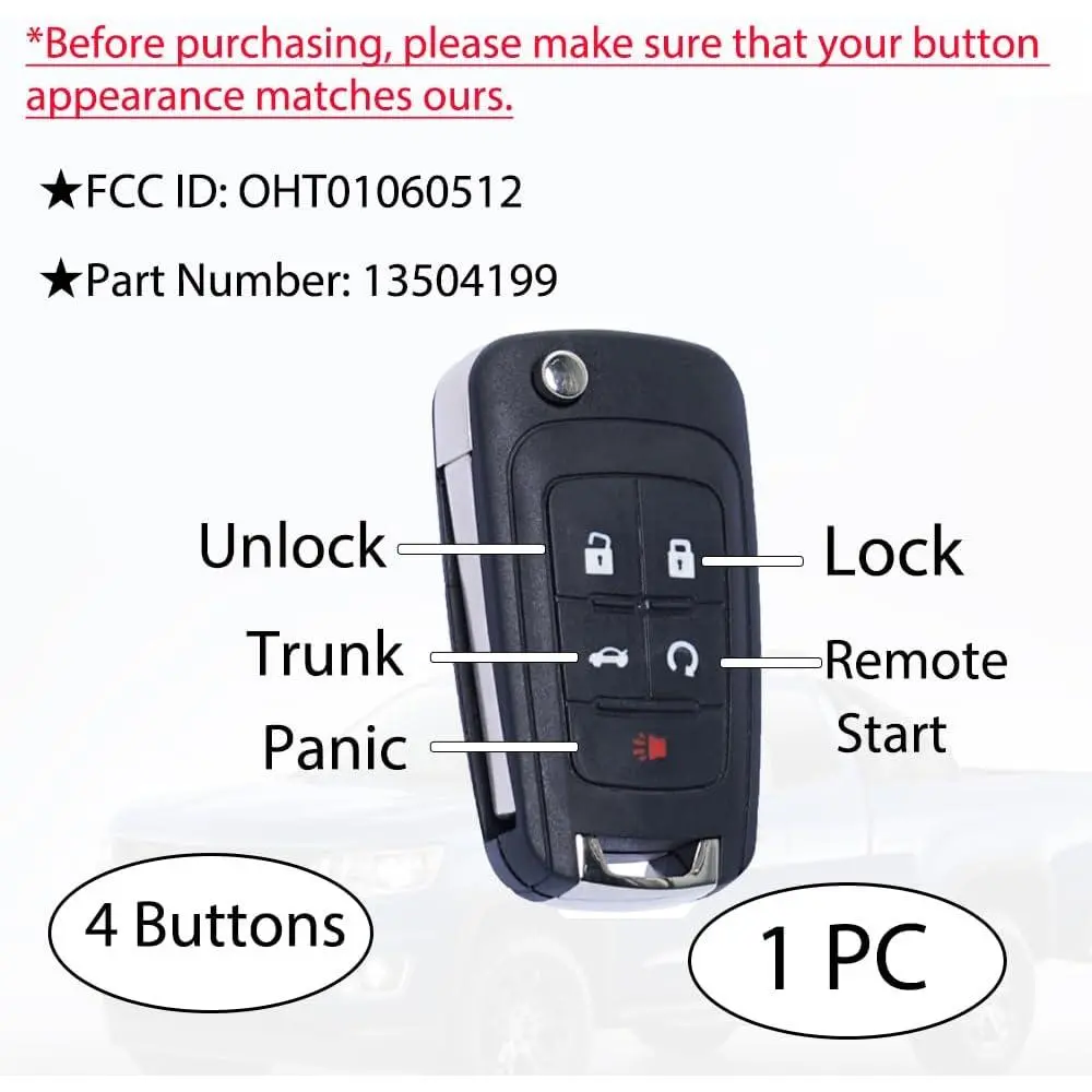 This key fob case cover fits Chevy Cruze, Camaro, Impala, Equinox, GMC Terrain, Buick Regal, and Lacrosse models from 2010-2017. It's a replacement shell for keyless entry remotes. Compatible with 2010-2021 uncut transponder keys. No logo or badge included. Requires self-programming by a locksmith or dealer for some models. Not for push start button vehicles.