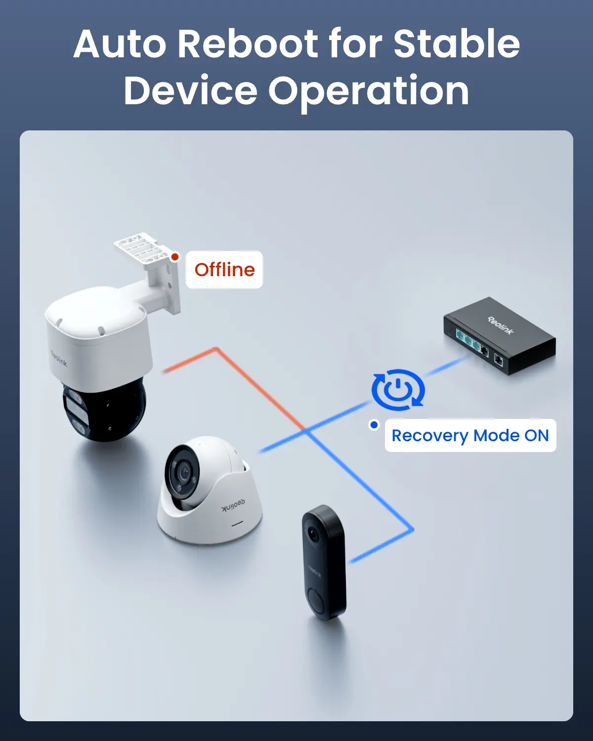 No more manual resets. Recovery Mode continuously monitors all connected PoE devices and automatically detects and reboots any that go offline or become unresponsive — keeping your security system running 24/7 without any intervention.