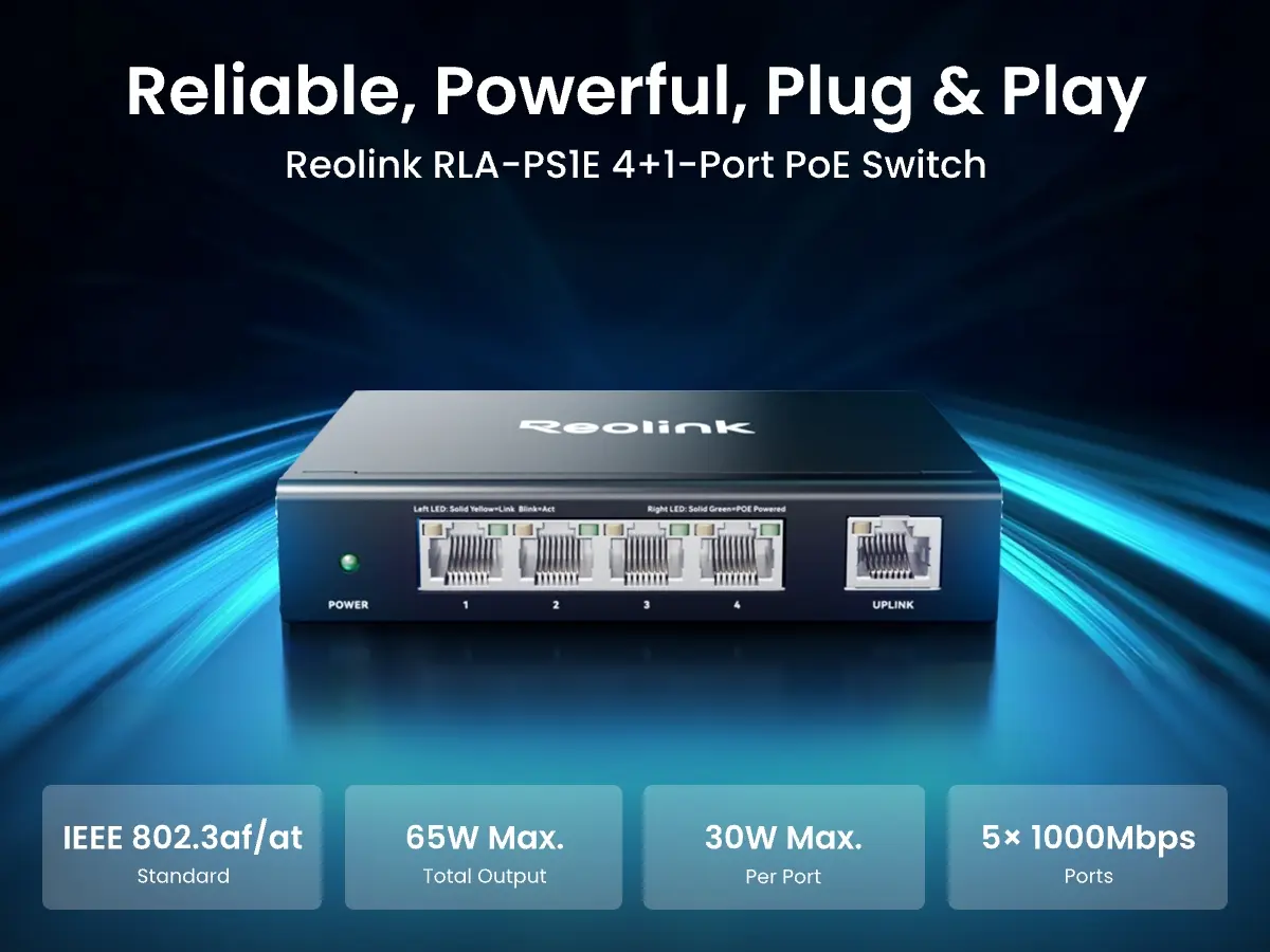 REOLINK RLA-PS1E — 5-PORT GIGABIT POE SWITCH | 65W POWER BUDGET | PLUG & PLAY SETUP