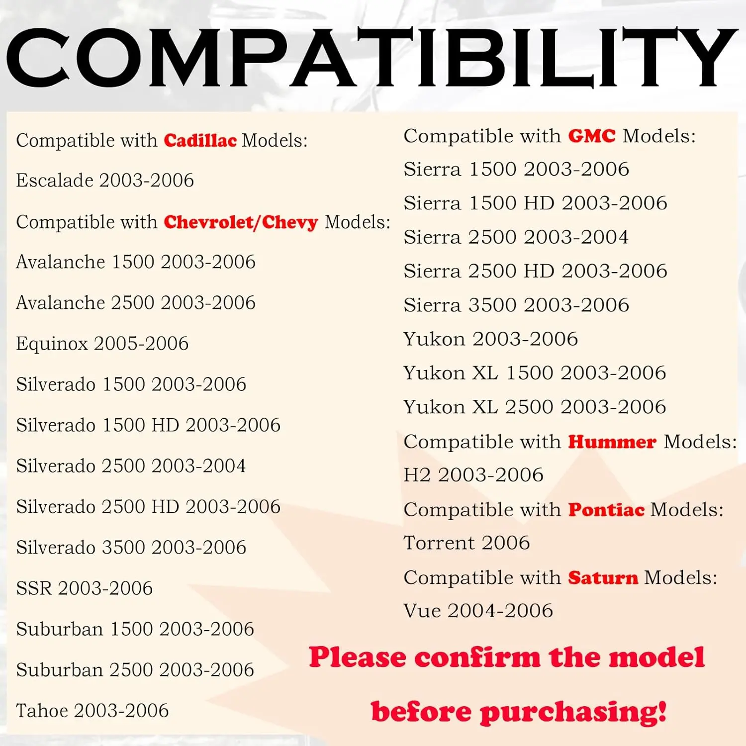 ·Compatibility: Chevrolet, GMC, Cadillac models listed.