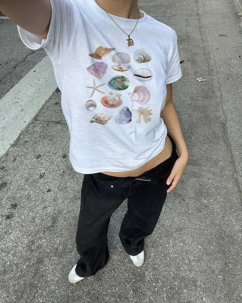 Seashell Collage Baby Tee – Vintage Coastal Graphic, Beachy Summer Aesthetic Outfit