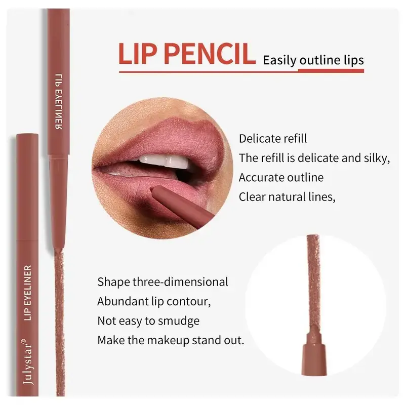 With this long-lasting lip liner set, you can create bold and sharply defined lips! This lip liner pen is specially designed for precise application. Its waterproof and non-creaming formula helps you shape and outline your lips. Its creamy texture is easy to apply, and once dry, it forms a matte finish, ensuring all-day wear without fading or smudging. It is perfect for creating clear contour lines or for filling out your lips to achieve a fuller look. Key features: High color intensity, vibrant color, waterproof and non-creaming, smooth texture, easy to apply, matte finish, lasts for several hours. Suitable for lip lines, fillers or outer outlining. It is a must-have for achieving perfect lip makeup.