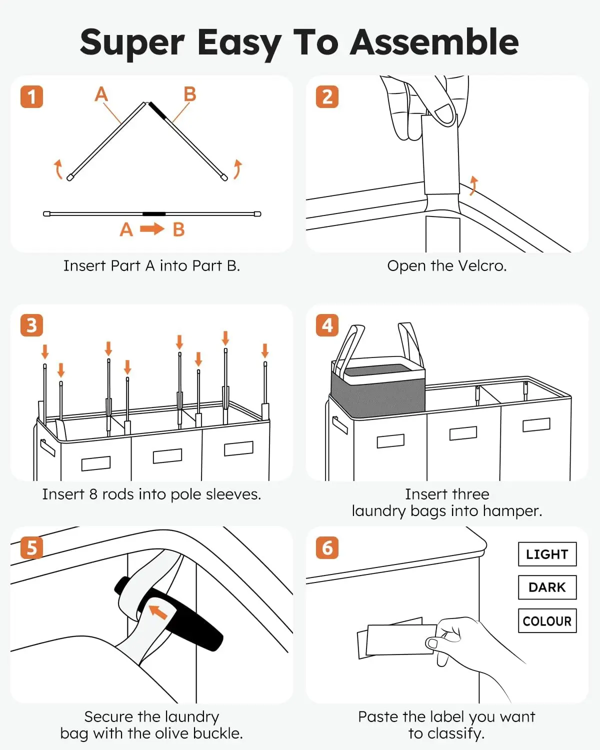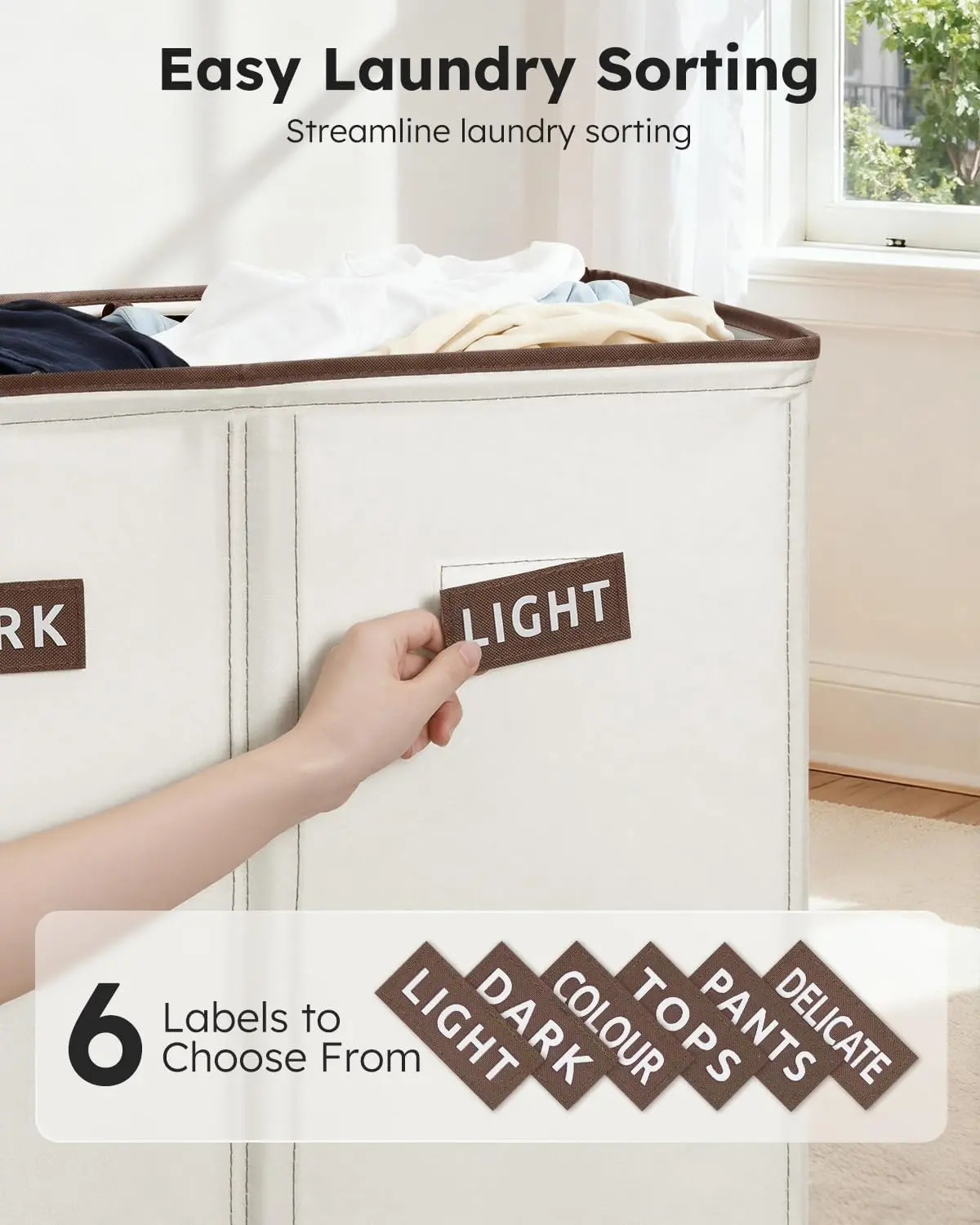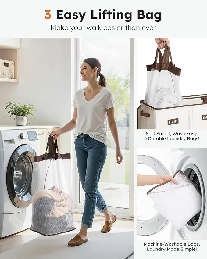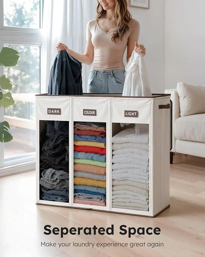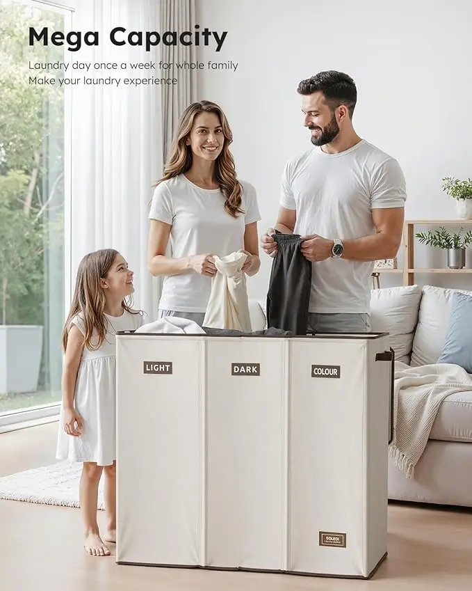 ·Extra Large 200L Capacity: Measures 33"L × 12.6"W × 30"H. Three compartments for whites, darks, and delicates reduce laundry trips and keep clothes organized. Perfect for families or couples.