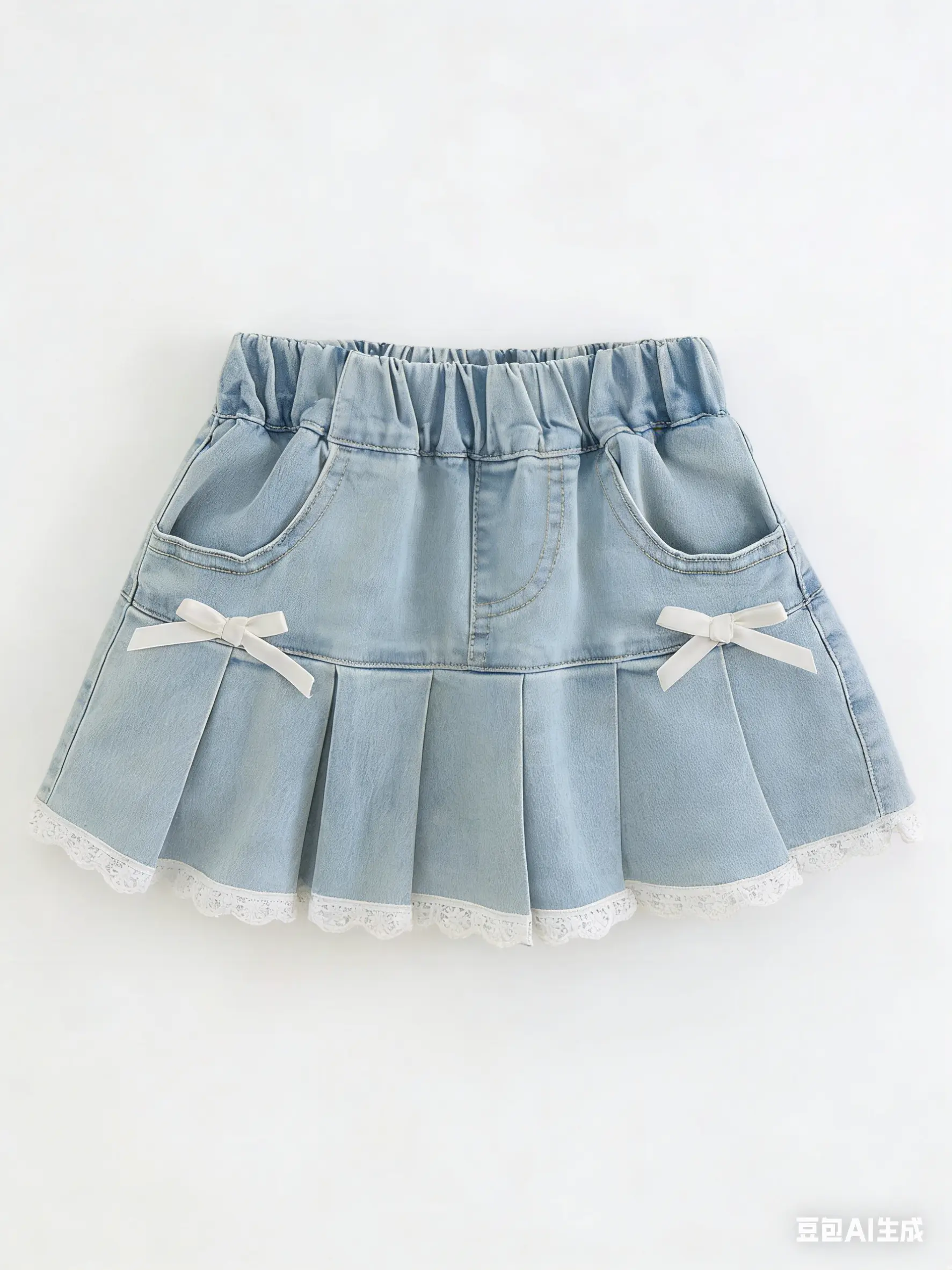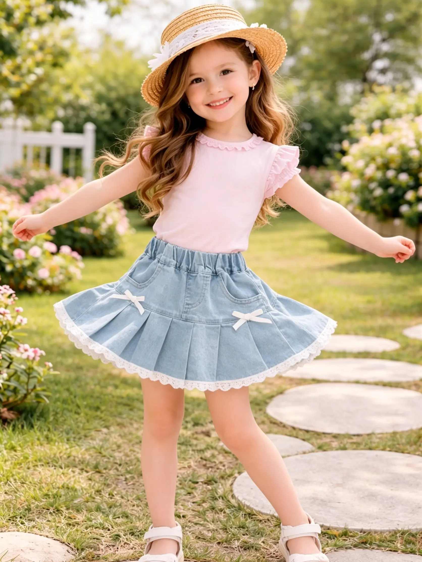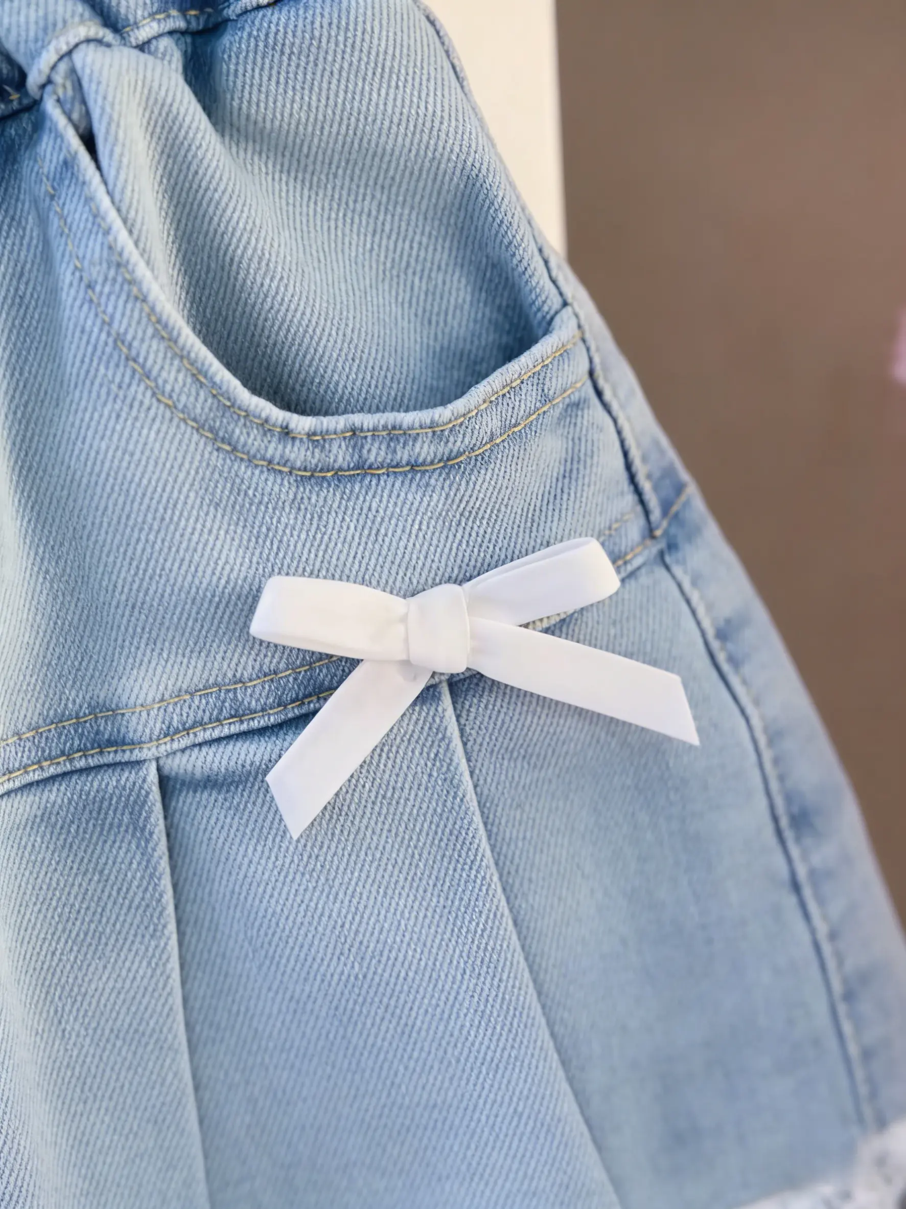 This girls’ denim skort combines…Pleated design + bow decoration + lace trimSweet, refined, yet practical for everyday wear. It appears like a mini skirt, but it’s designed with shorts underneath—stylish and easy to move around in, making it a must-have for summer outings and photoshoots.