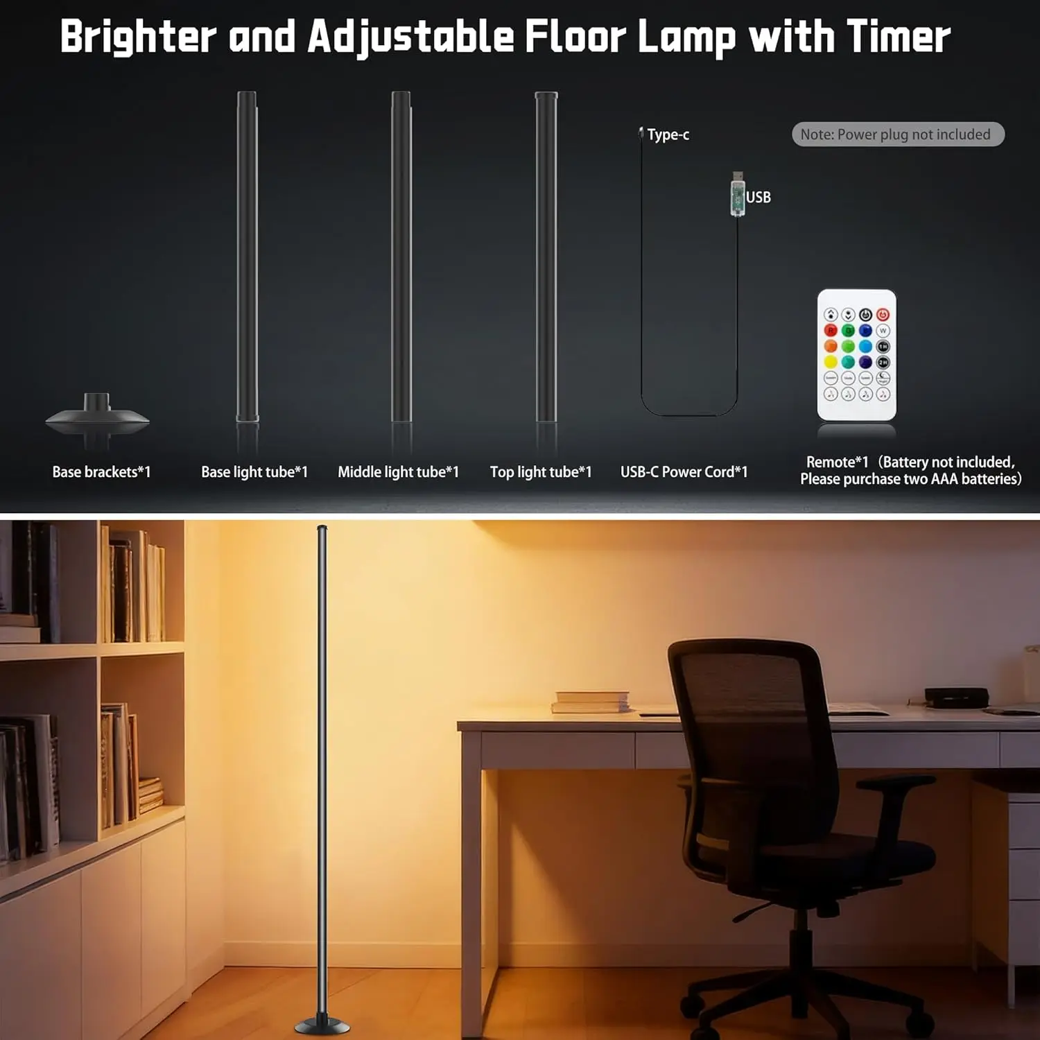 ·Easy to install: NBBUFF cormer floor lamp is equipped with a 60-inch usb power cord, making it more portable and safe. The package contains: base light tube*1,top light tube*1,middle light tube*1, lamp base*1, usb to usb-c charging cables*1, Remote*1 (Battery not included), Instruction manual*1. After installation, the total height of the corner led light is approximately 48.65 inches /123.5cm, and the diameter of the base is about 5.2 inches /13.5cm. (Tips: You have the option of installing just two sections of the lamp tubes, or all three.)