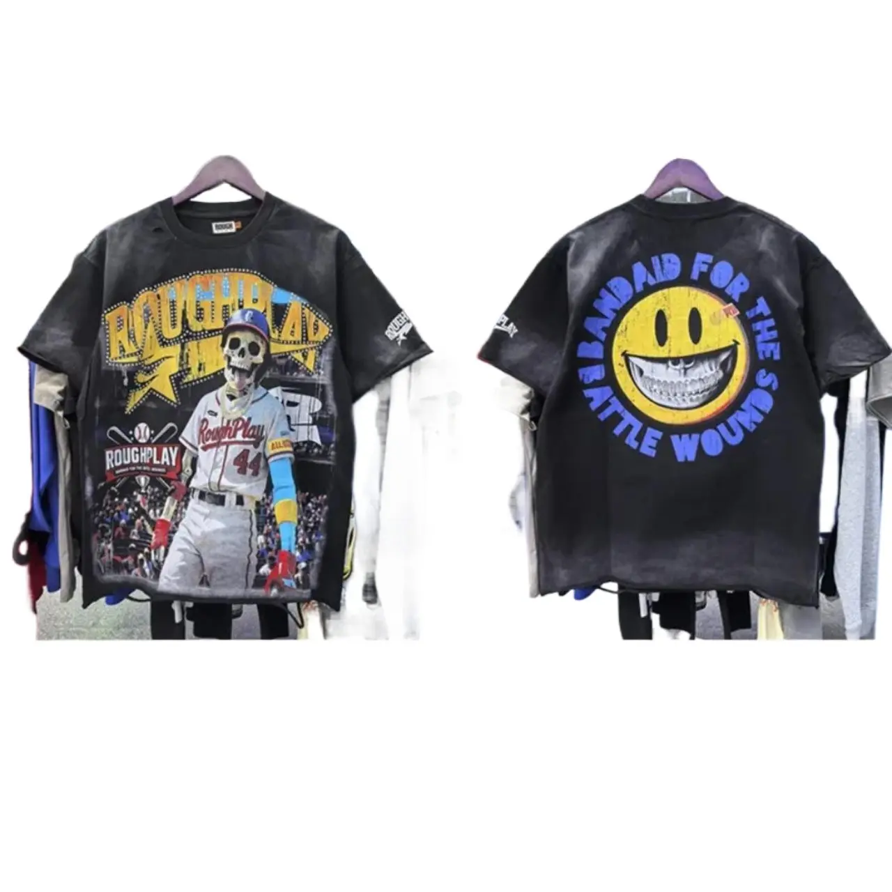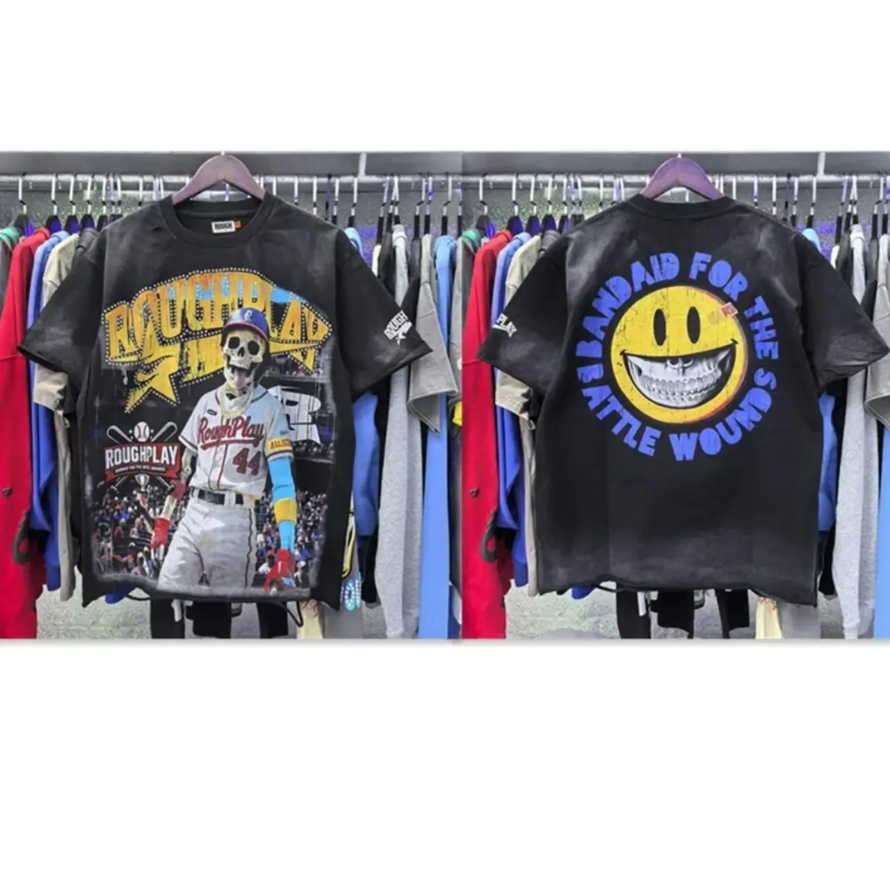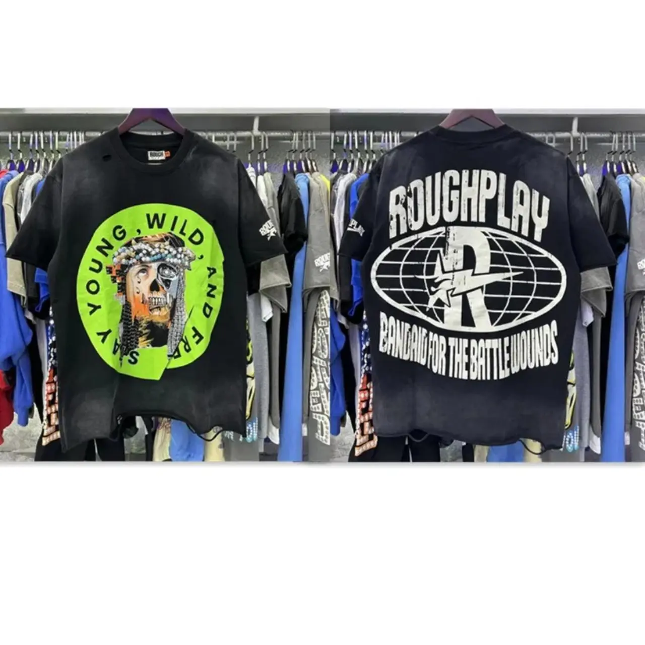 Vintage Washed Roughplay T-Shirt, Heavyweight White Ink Jesus Skull Print, Retro Rockabilly Bling Diamond Patchwork, American Hip Hop Unisex Streetwear Short Sleeve Cotton Tee