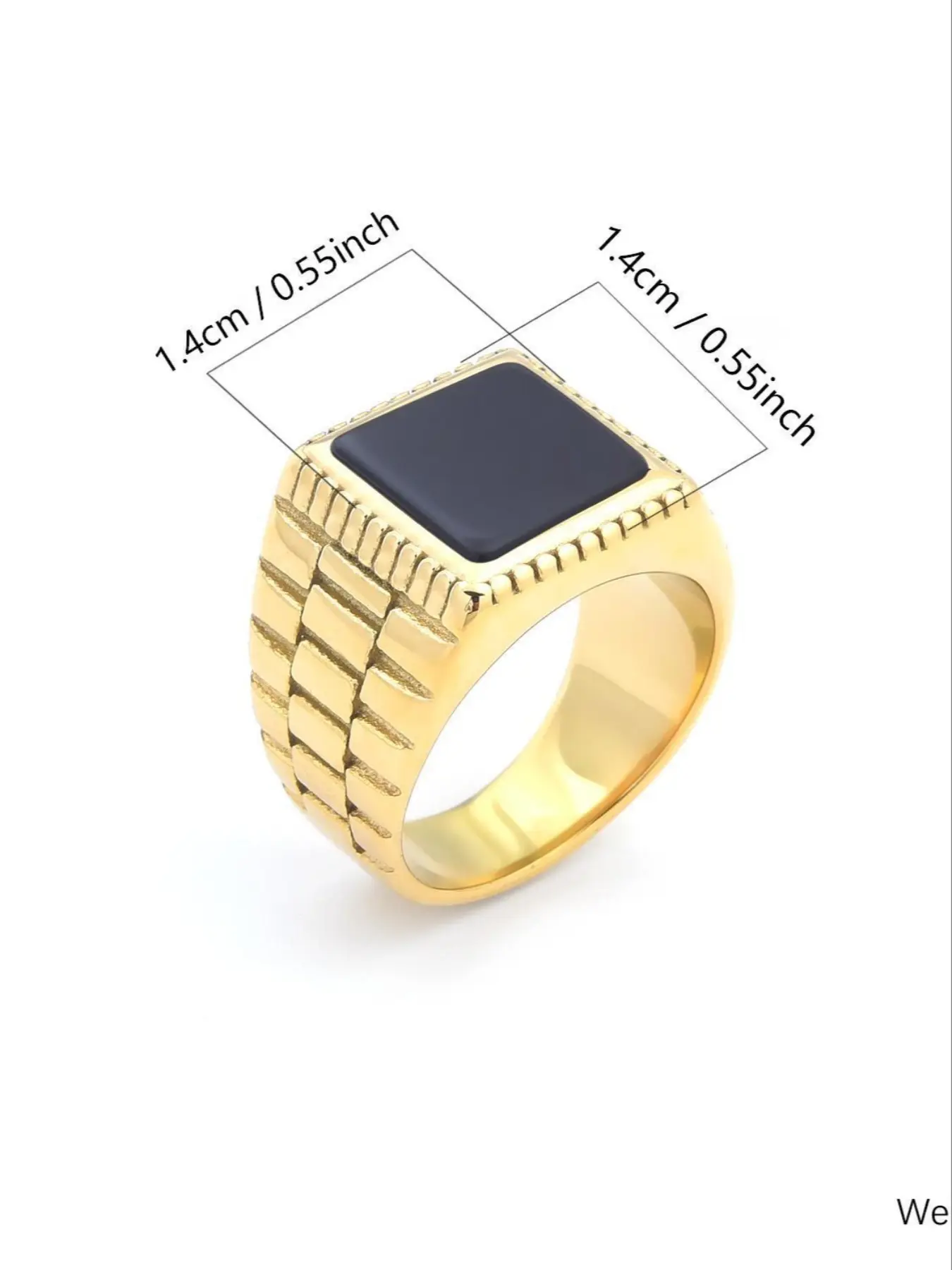 High-Quality Men's Ring, 18K Gold Plated Tarnish-Free, Square Black Gemstone Exudes Boldness