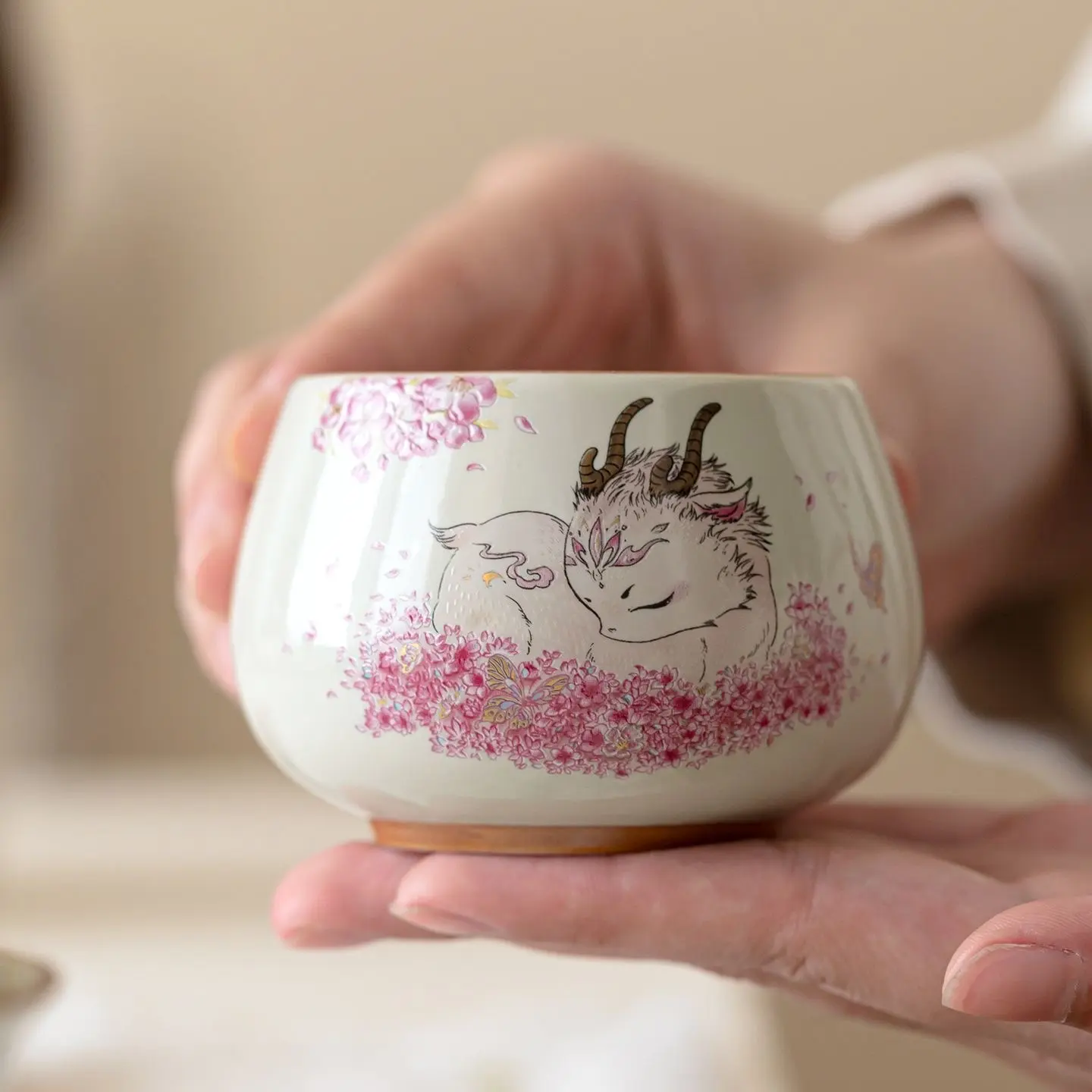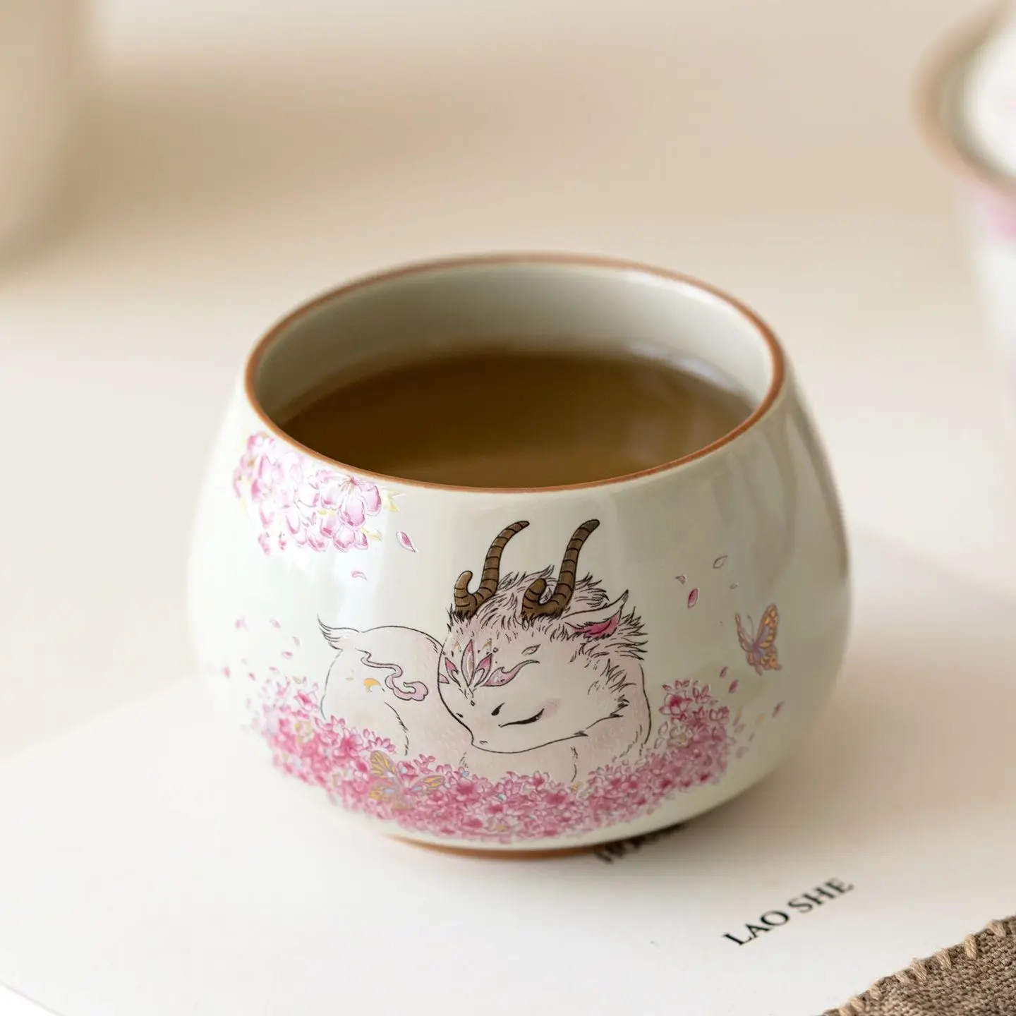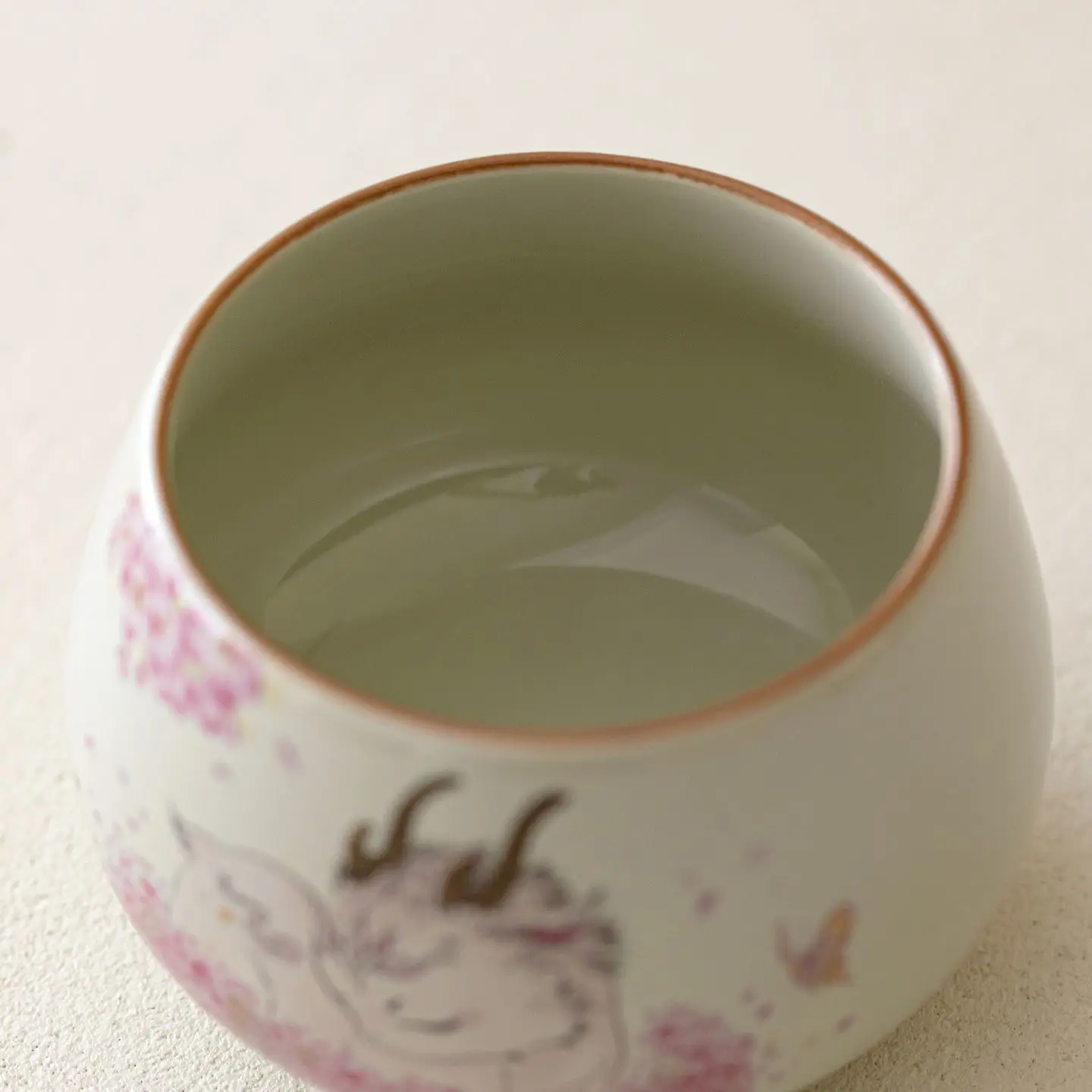 A424. Cute Pink Ceramic Tea Cup with Plant Ash Glaze and Lucky Deer Design — Personalized Tea Cup
