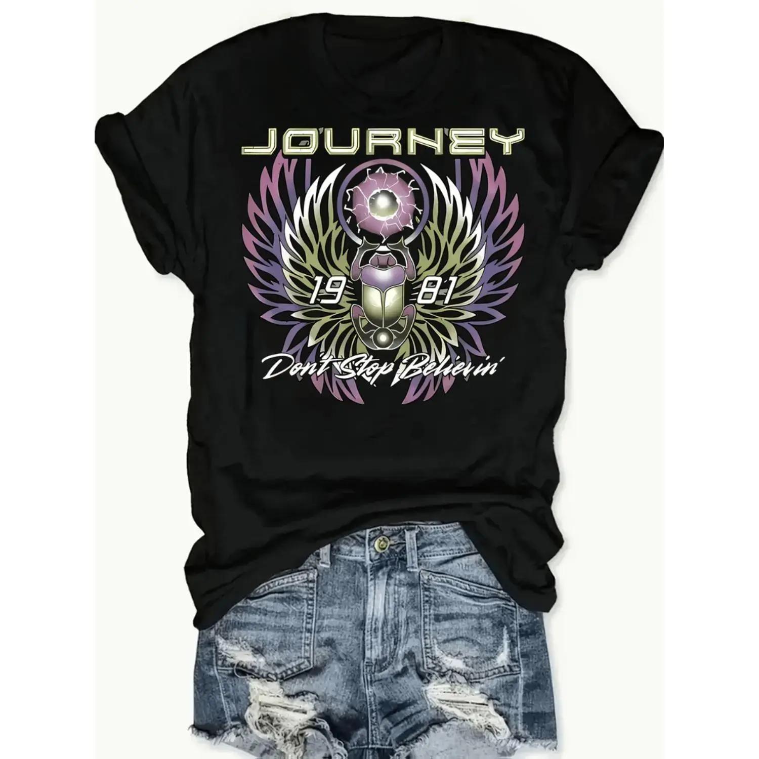 5. Women's Printed Rock Heritage Top, Journey Don't Stop Believin' 1981 Print, Short Sleeve Round Neck Casual Shirt, Medium Stretch
