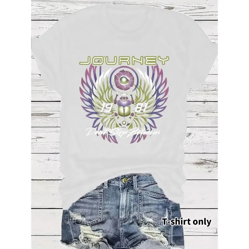 Women's Printed Rock Heritage Top, Journey Don't Stop Believin' 1981 Print, Short Sleeve Round Neck Casual Shirt, Medium Stretch