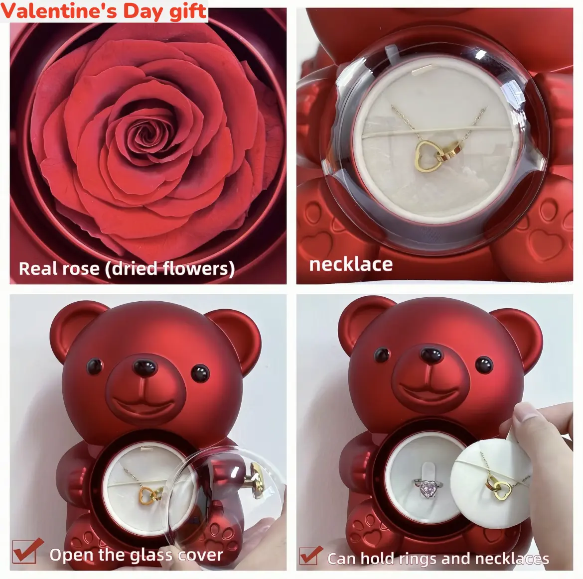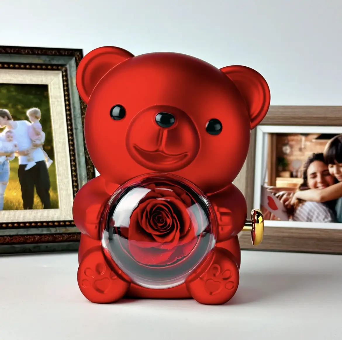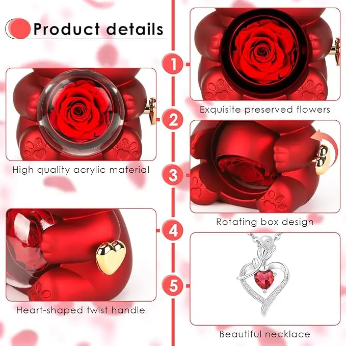 ·Real preserved rose – A naturally preserved, long-lasting rose is set inside the bear’s clear heart chamber, keeping its color and beauty without watering or maintenance.