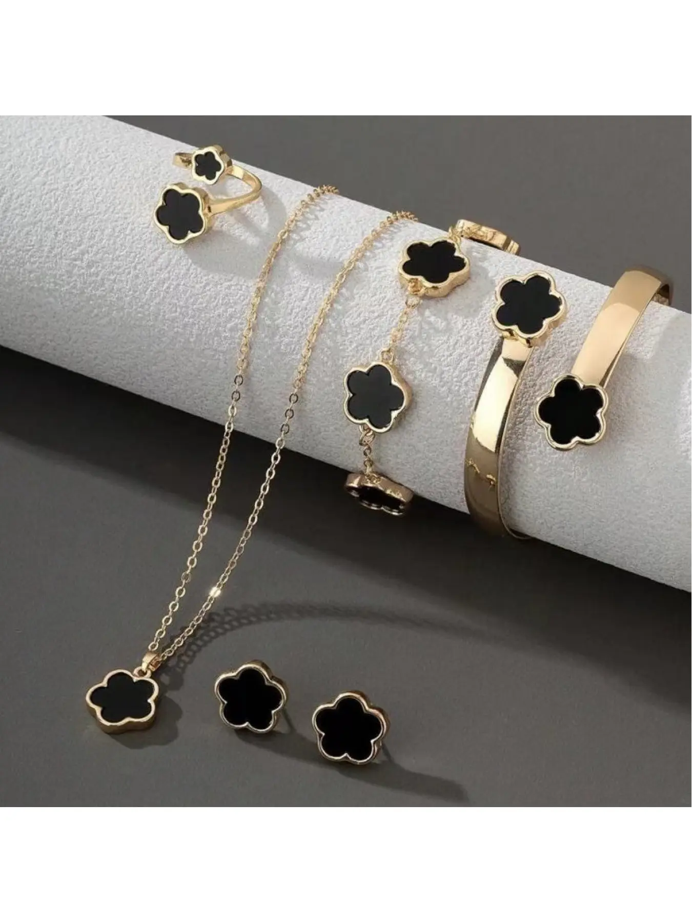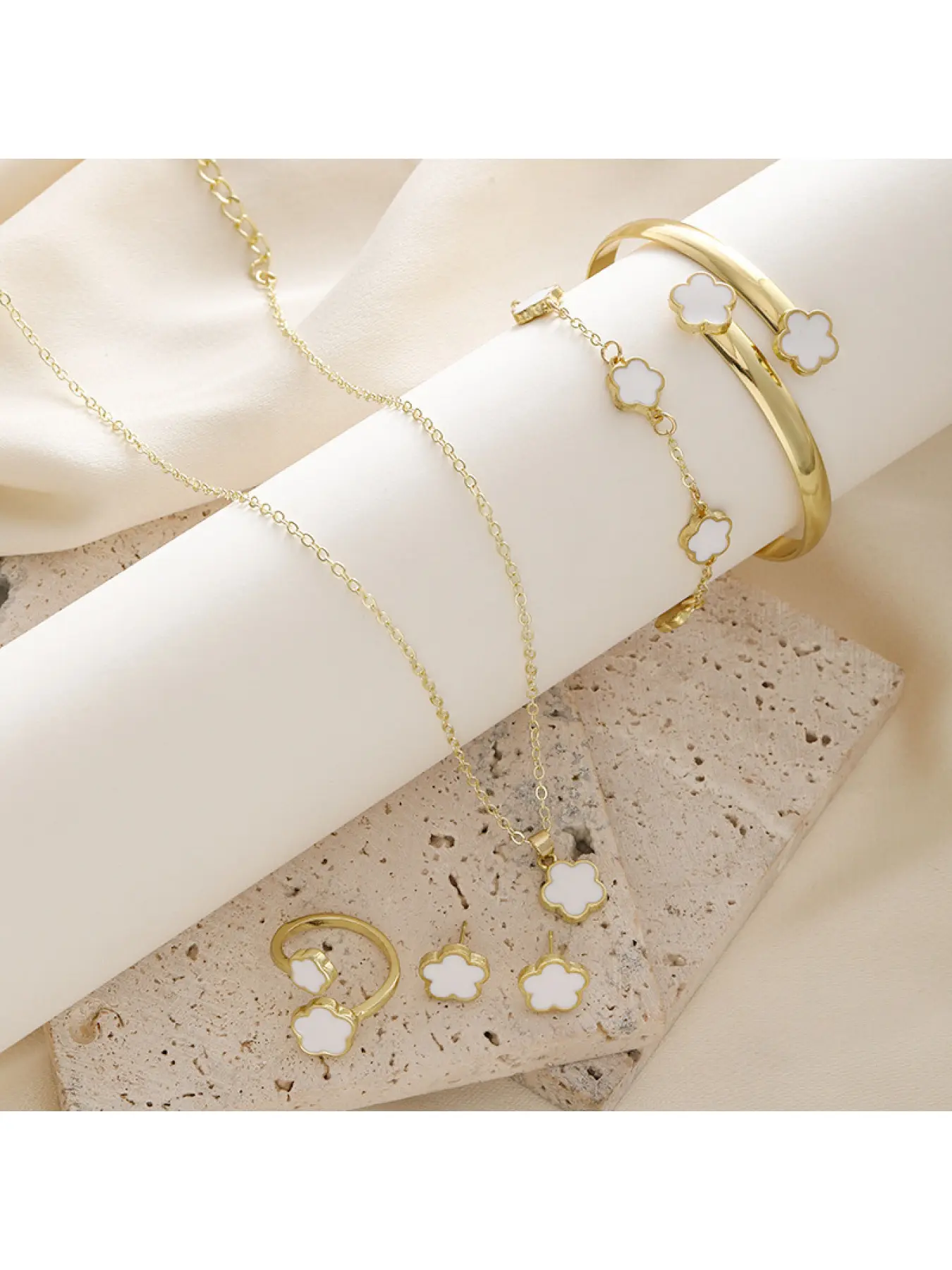 【Five-Piece Set】: Includes necklace, earrings, ring, bracelet, and bangle for complete accessory coordination.