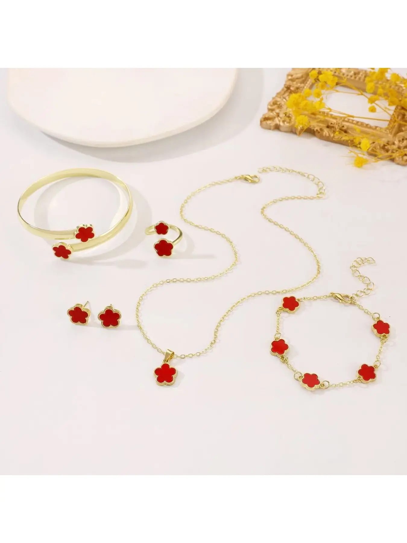 Flower Design (5-piece set), 2025 Summer Clothing Women's Solid Color Bracelet Necklace Bracelet Ring Bracelet, Party, Daily Clothing Decoration, Birthday Gift Jewelry, Party Preparation Bracelet, Fashion Bracelet