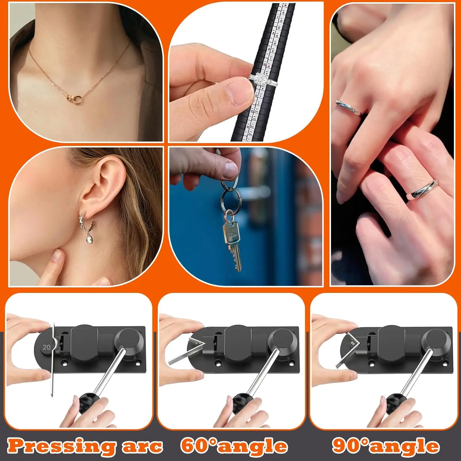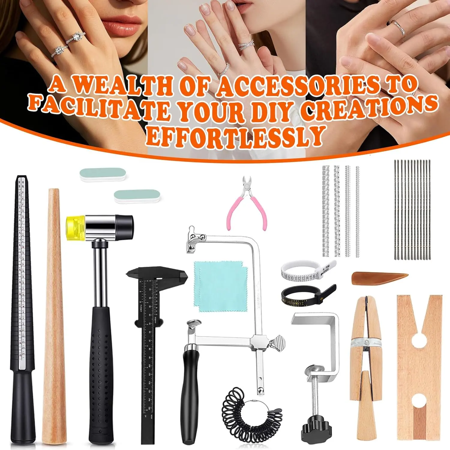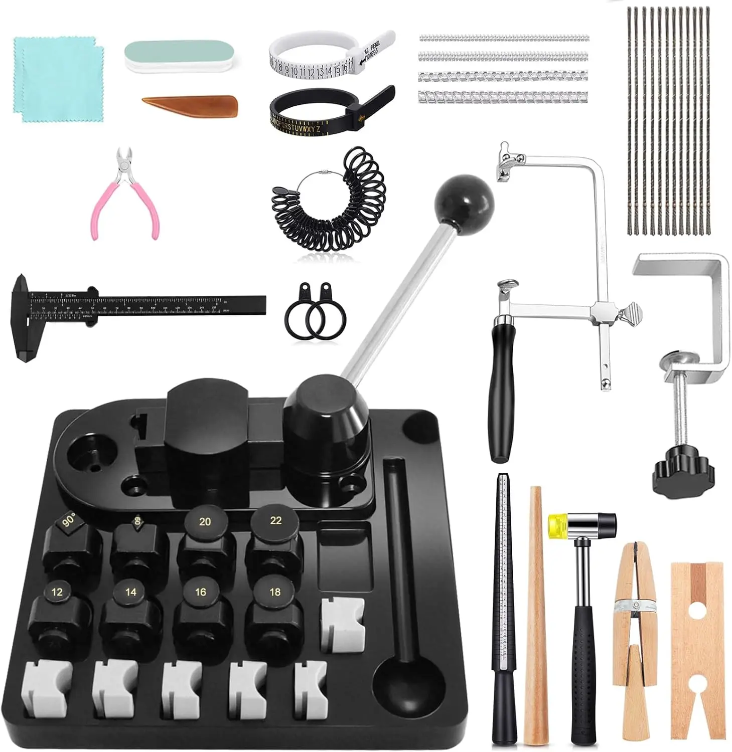·Comprehensive Tool Kit: Includes ring bender, rubber mallet, wooden dowel, metal ring sizing rod, ring mandrel, UK/US measuring kit, polishing stick with agate burnisher & cloth, ring holder,Jewelry saw and wire cutters—covering all jewelry-making essentials