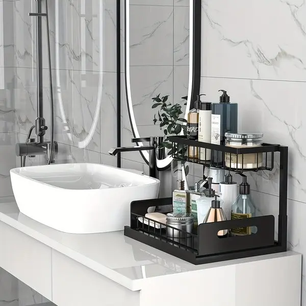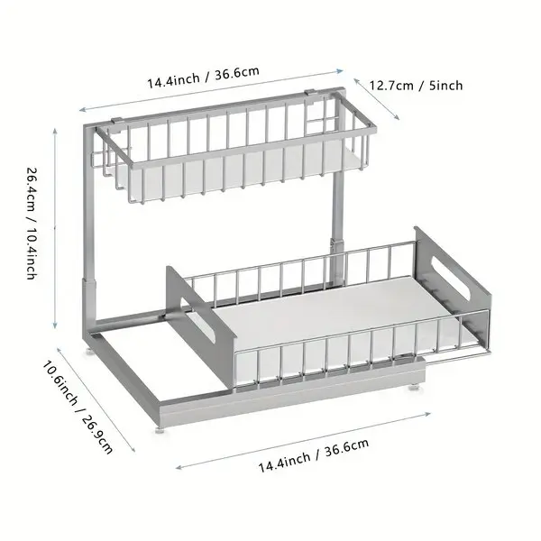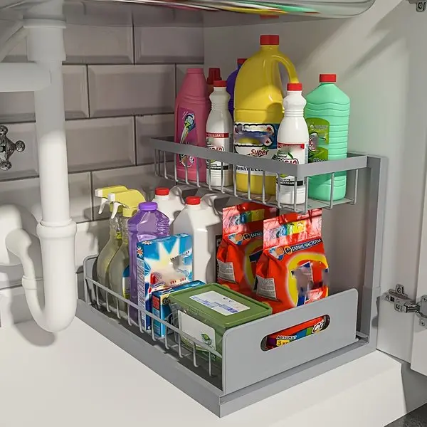 Maximize your storage space with this 2-level under sink organizer, designed for easy access, durability, and clutter-free organization.