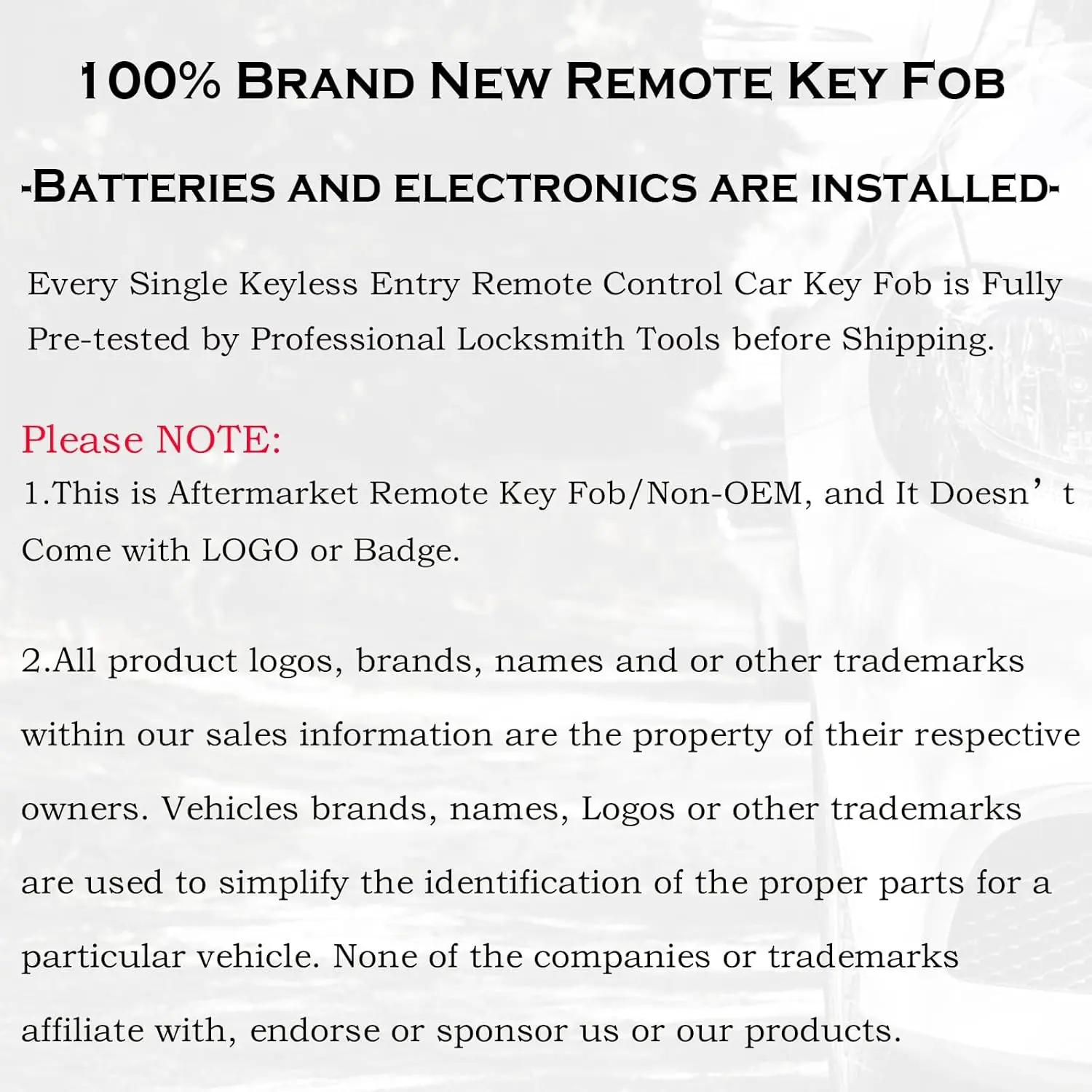 This is Aftermarket Remote Key Fob/Non-OEM, and It Doesn’t Come with LOGO or Badge. All product logos, brands, names and or other trademarks within our sales information are the property of their respective owners. Vehicles brands, names, Logos or other trademarks are used to simplify the identification of the proper parts for a particular vehicle. None of the companies or trademarks affiliate with, endorse or sponsor us or our products.