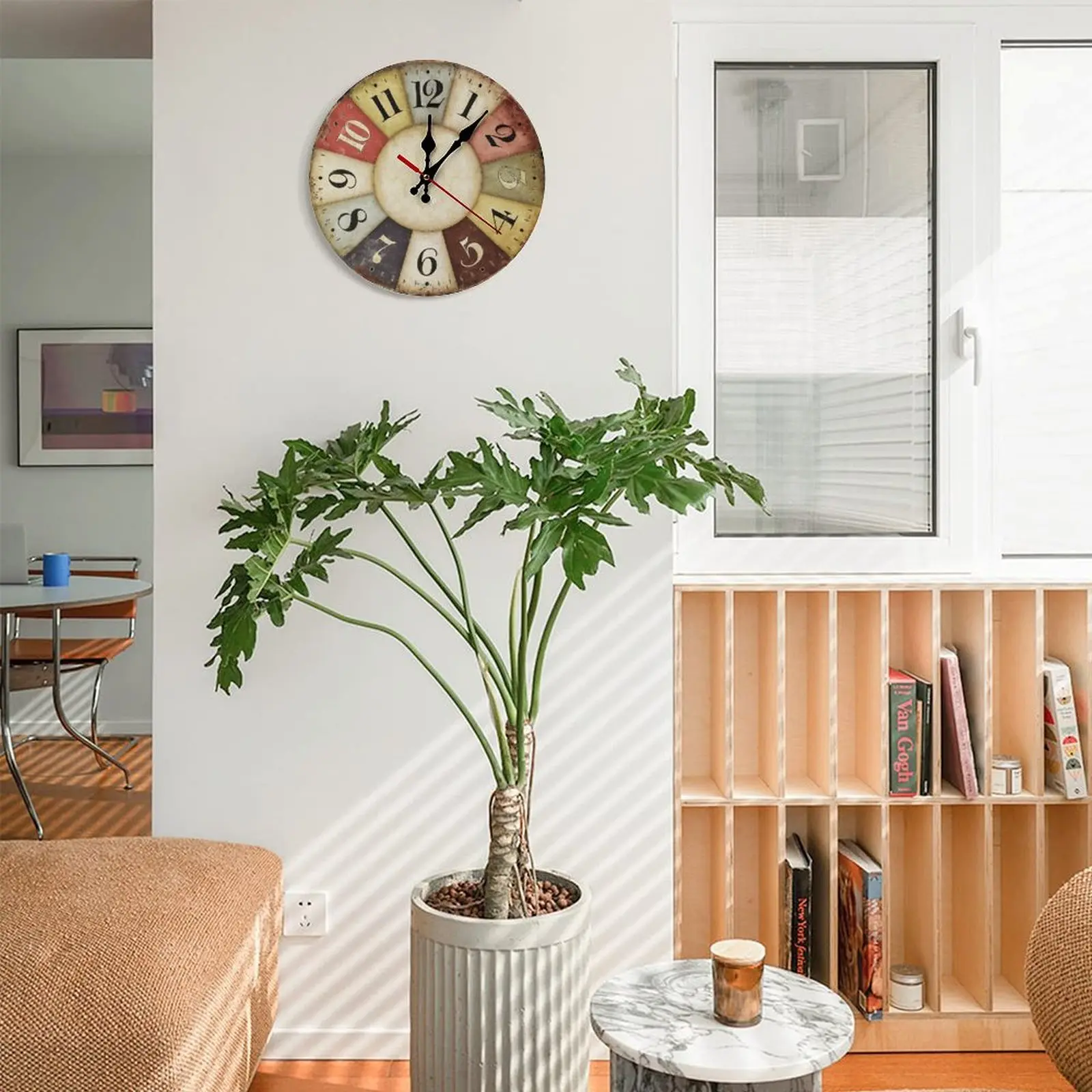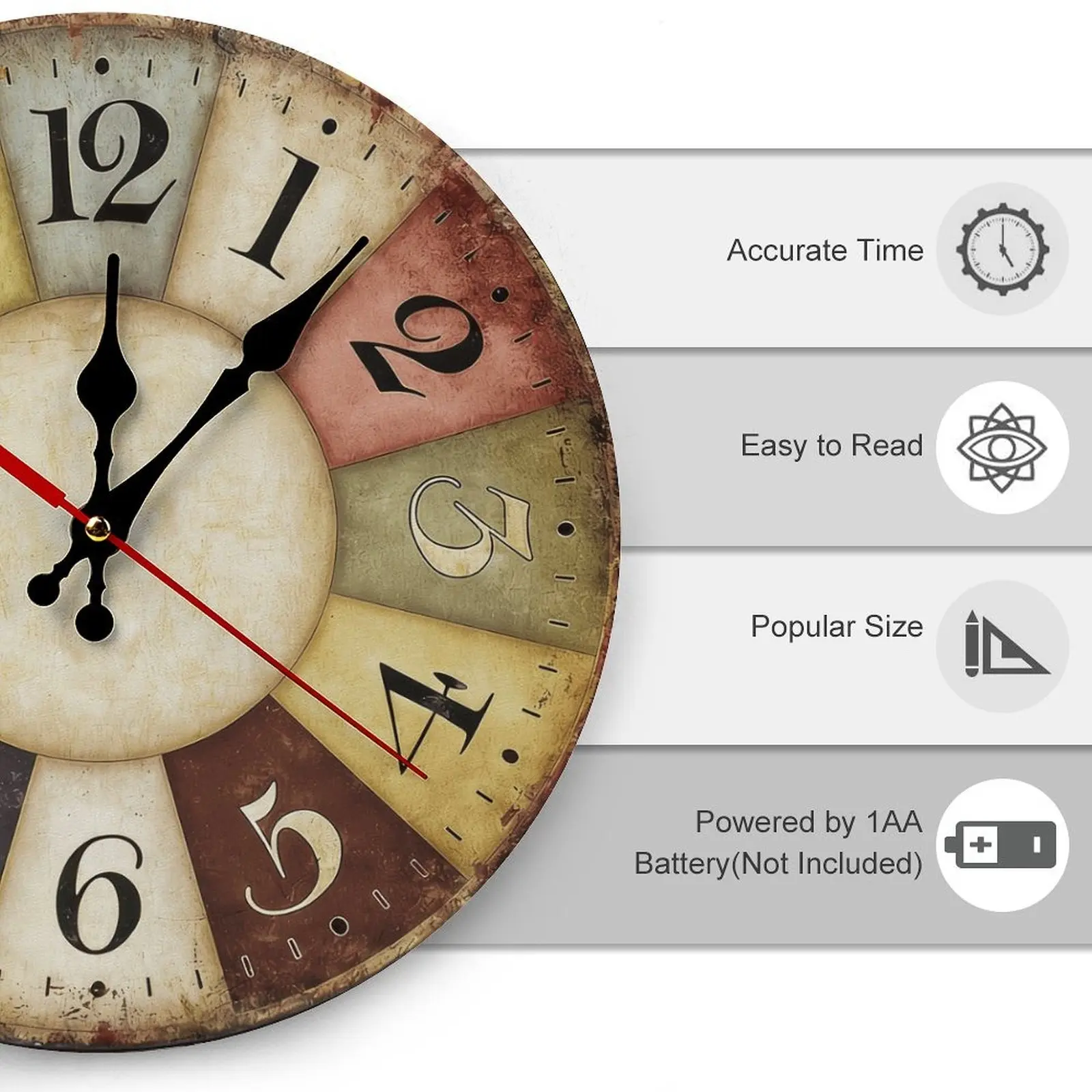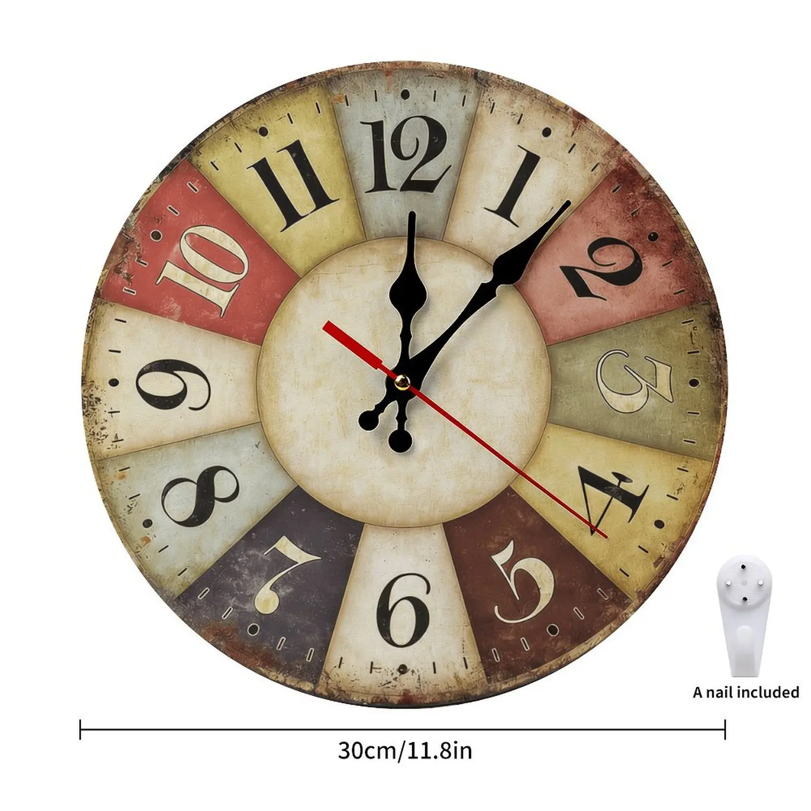 Retro Color Block Patchwork Design: Unique segmented clock face in muted multi-colors (red, yellow, dusty rose, olive green, etc.) with a distressed, worn texture creates a timeless vintage aesthetic