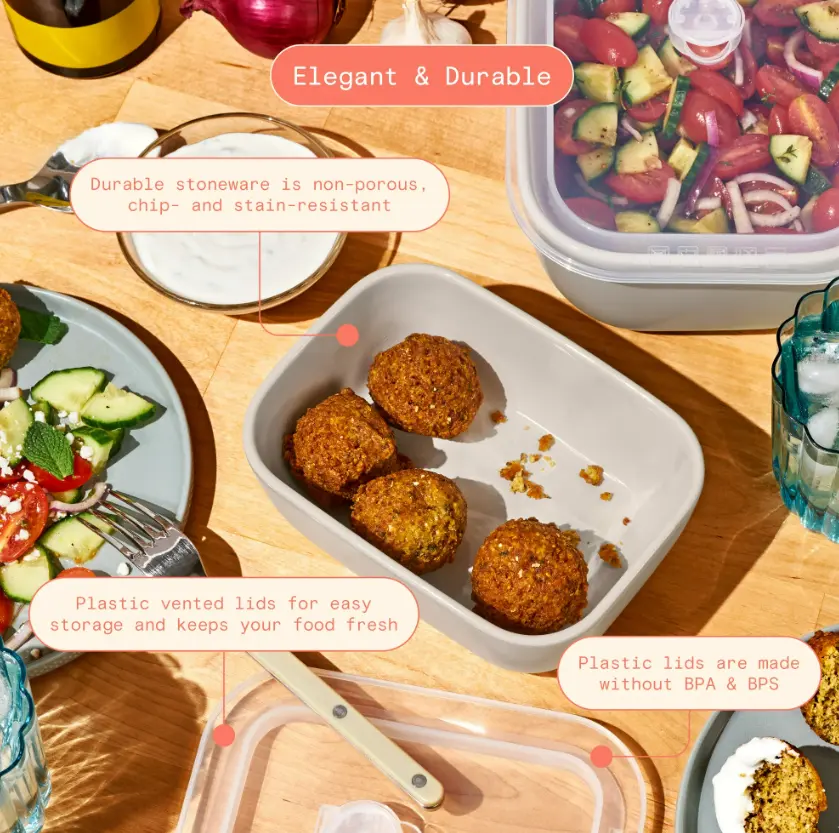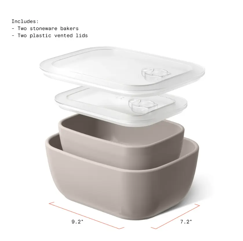 Perfect for Baking and storing your favorite homemade treats just go so much easier (and prettier too) with the 4-Piece Stoneware Bake & Store Set. This versatile set includes two stoneware bakers and two matching lids, making it easy to prepare, bake, and store your favorite dishes. The durable stoneware ensures even heat distribution for perfectly baked meals, while the snug-fitting, vented lids keep your food fresh for easy storage and for quick reheating.