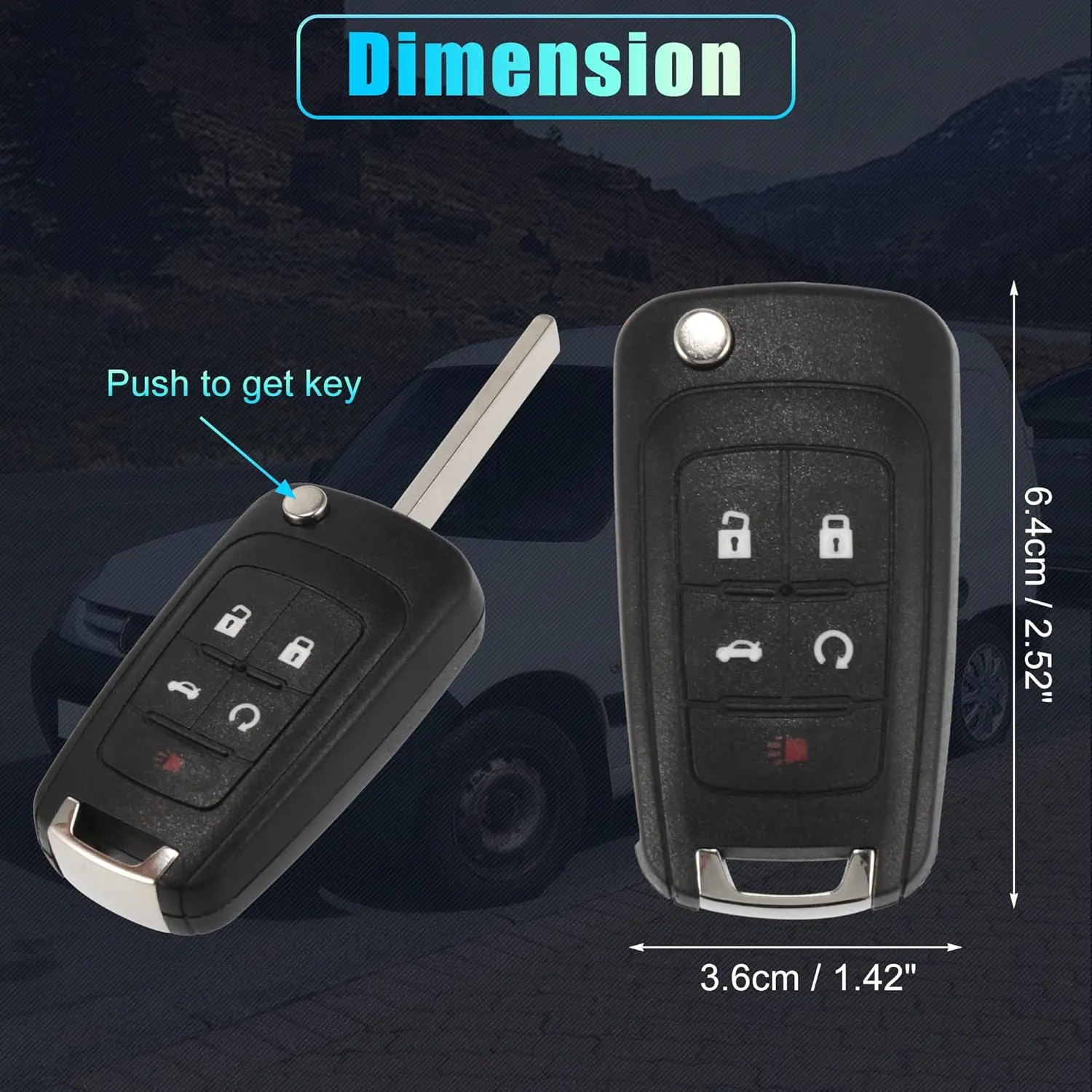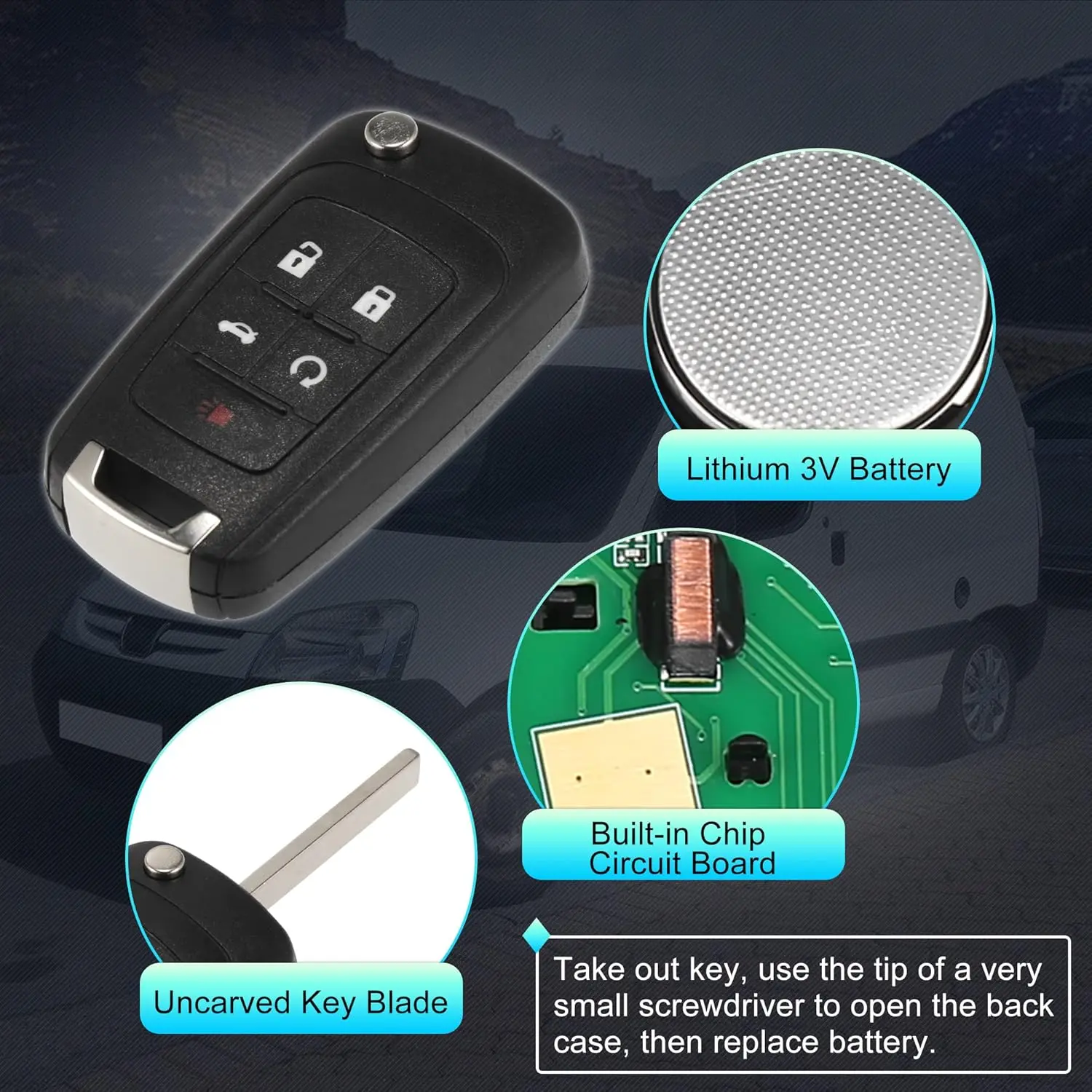 To replace the battery, remove the key and use a screwdriver tip to open the back case. Carefully replace the same battery. Clean the battery with a cloth if needed. The package includes one car keyless entry remote with a battery.