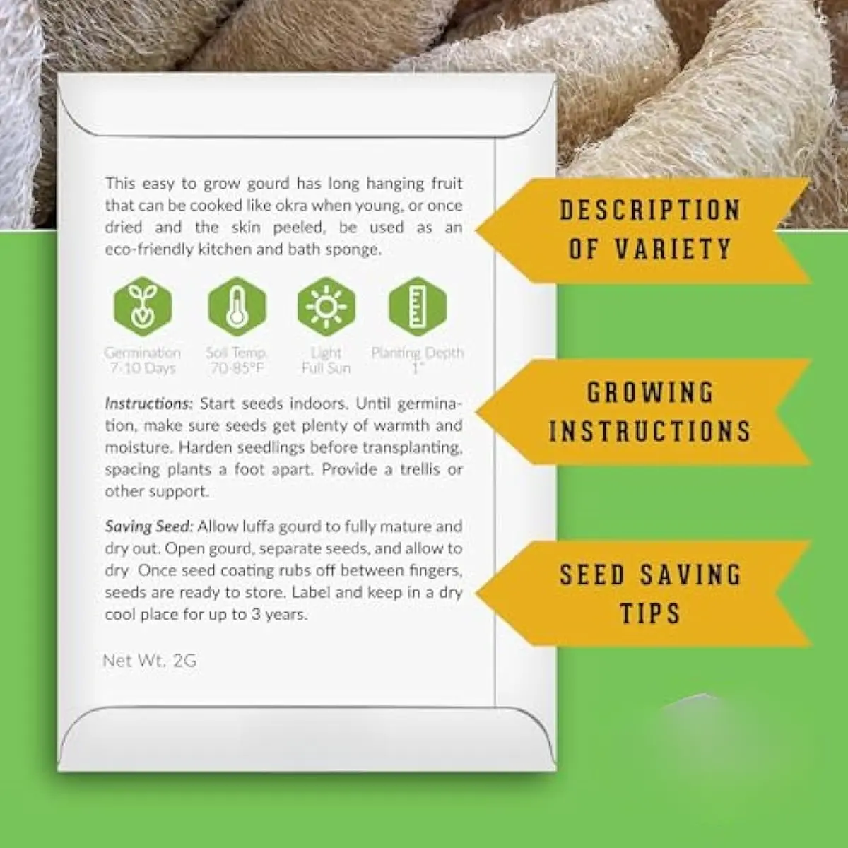 The Info You Need to Grow - The Loofah seeds for planting are packed in a beautiful paper packet with instructions for successful growing and germination in your home garden. Each package also has instructions for saving seeds after harvest.