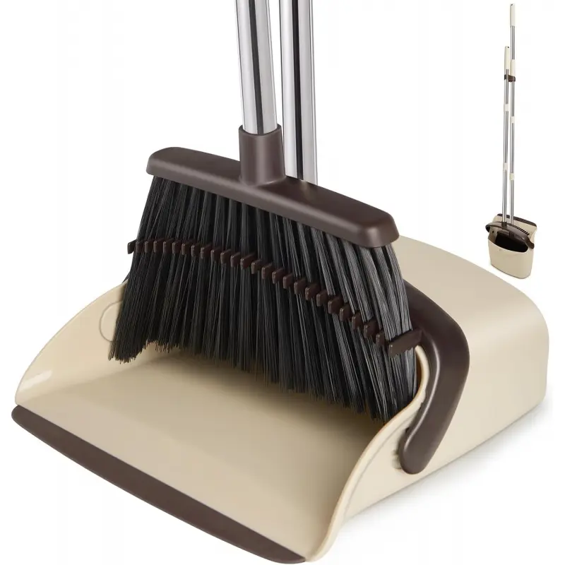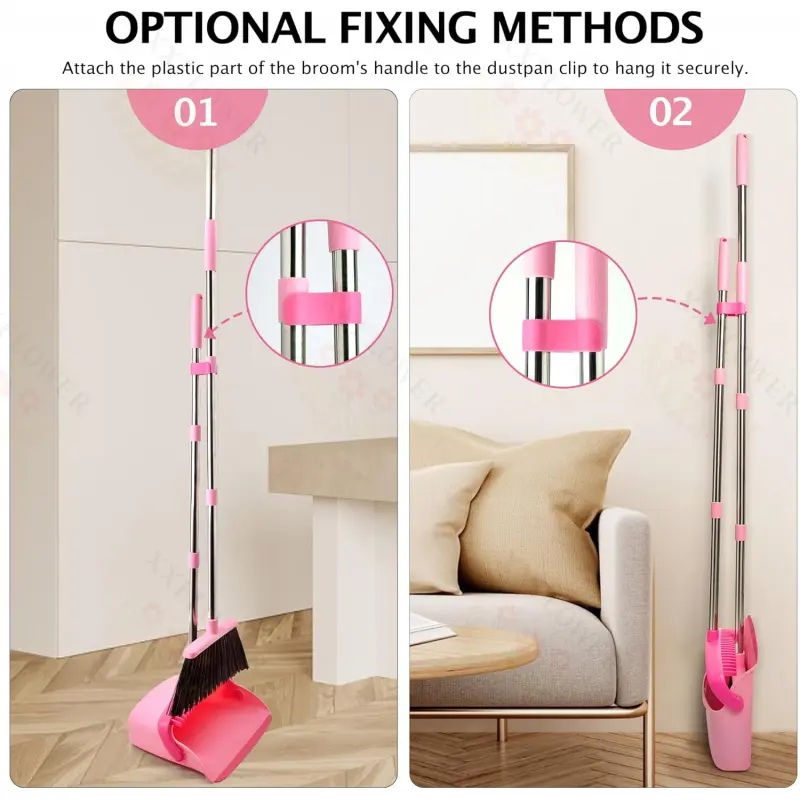 [STYLISH DESIGN]: The house broom and dustpan set features an extended long handle and a large capacity dustpan, making it ideal for brooms for sweeping indoor. The long handle enables you to stand upright and sweep comfortably without the need to bend down. Additionally, the set includes comb teeth that effectively remove residual hairs from the broom bristles, ensuring clean hands and protecting your back. Moreover, the set comes in a stylish color scheme, adding a touch of elegance to your daily cleaning routine as kitchen decor and accessories, and is a must-have among home essentials and daily cleaning supplies. [DURABLEMATERIALAND SIZE]: The brush measures 12. 6 " x 55", and the dustpan measures 12 " x 10. 6" x 42. 5". This house broom and dustpan set is constructed using high-quality materials, ensuring its durability. You can rely on its sturdy build to withstand daily use and effectively maintain cleanliness in your space for many years. As reliable cleaning supplies and home essentials, it performs well in daily use. [EASY STORAGE]: The broom and 90 ° folding dustpan set features a compact design, making it convenient for storage. Simply clip the broom onto the dustpan handle and hang them together on the wall. The broom's handle can be effortlessly attached to the dustpan, effectively saving space and ensuring that they are always within reach when needed. This space-saving design makes it a addition to your kitchen decor and accessories and useful home essentials. [EASY TO CLEAN]: The long-handled dustpan and broom has a smooth dustpan edge that sits flush with the ground. Compared with the square bristles used in other brooms, the angled bristle design of this house broom is more convenient for reaching into narrow areas such as corners and the bottom of furniture, and can effectively absorb dust, hair and other fine particles from various surfaces. As ideal brooms for sweeping indoor, this set is a choice among daily cleaning supplies. Cleaning the broom and dustpan set is a breeze. Simply rinse under running water or wipe with a damp cloth to remove any dirt or debris. Maintenance is quick and easy. [WARM TIPS]: If you are not satisfied with the cleaning supplies or have any concerns, please feel free to contact us!We are happy to help and guide!