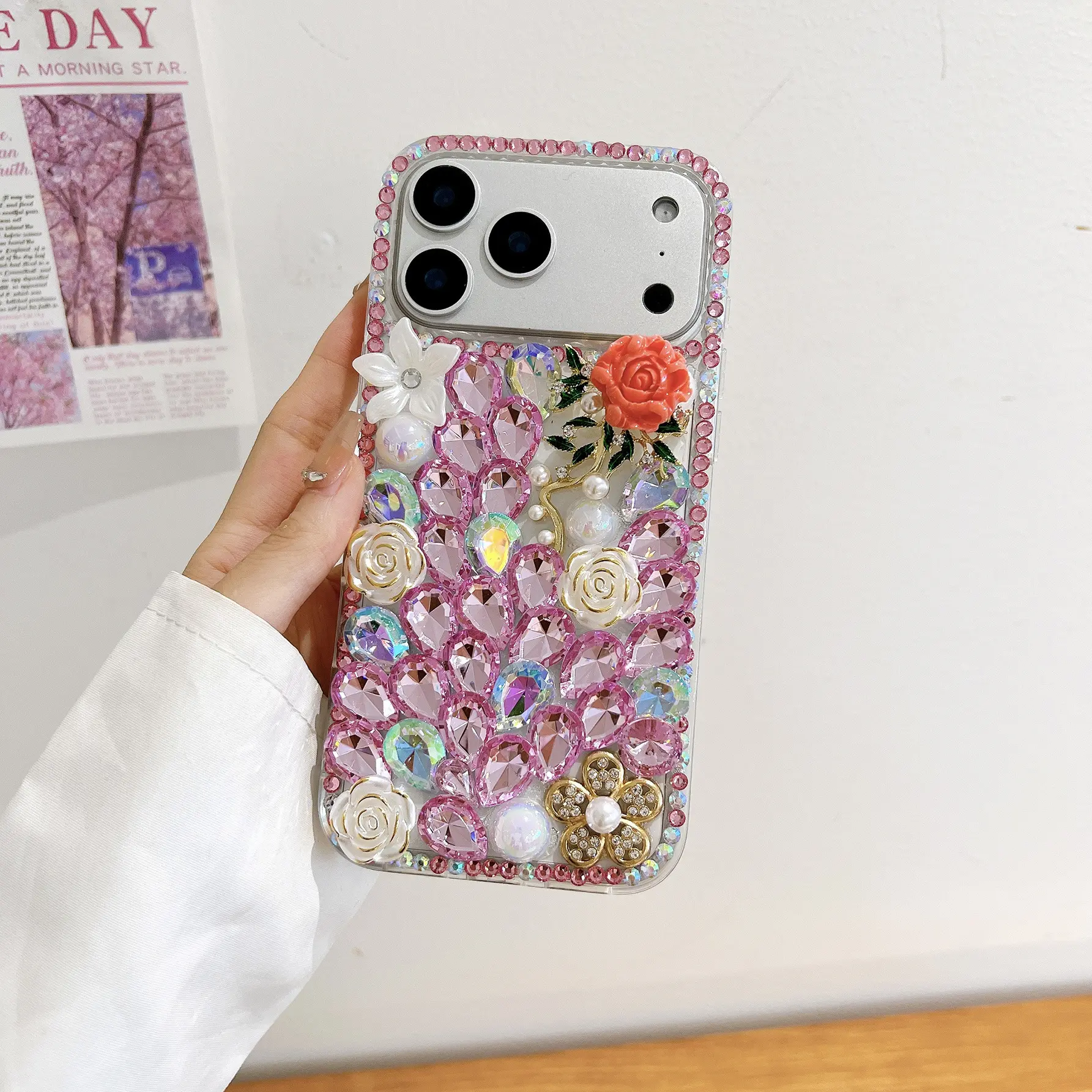 Suitable for Apple 14 Pro phone case, red rose rhinestone iPhone 17 Pro luxury full-cover 15 three-dimensional protective case