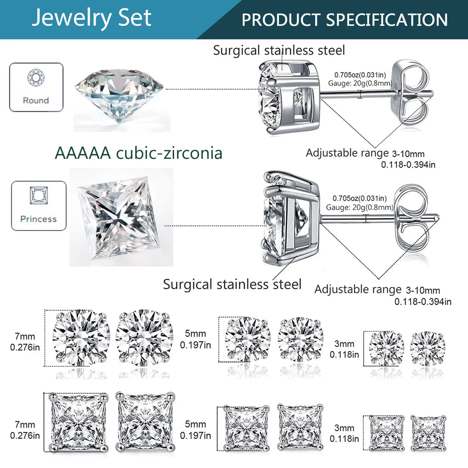 • The set offers 3/5/7mm round and princess square studs. Post gauge size is 20G(0.8mm). Various sizes suit multiple ear piercings.